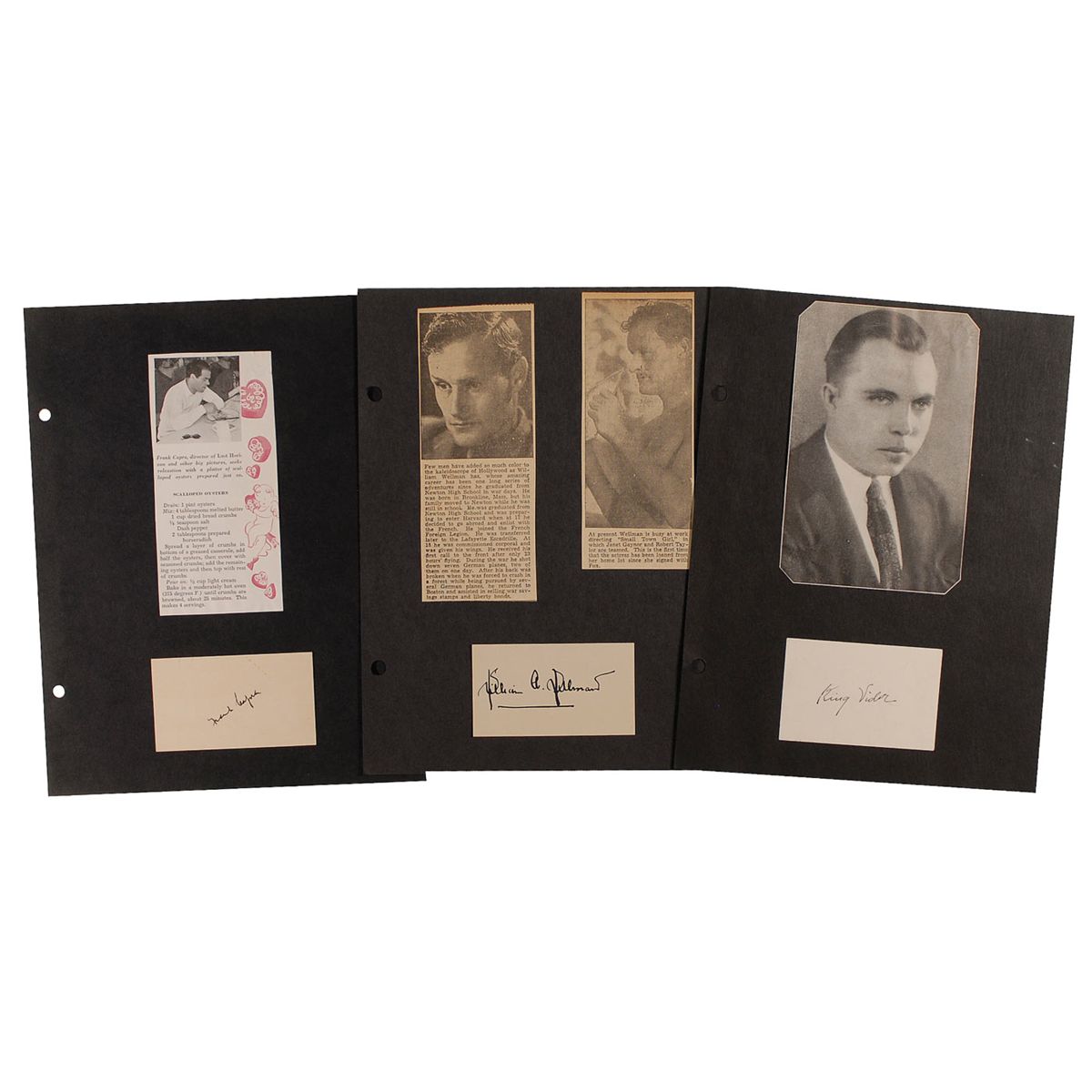 Three vintage fountain pen signatures on off-white cards, ranging in size from 3.5 x 2 to 3.5 x 2.25, each affixed to individual 8 x 10.5 album pages with clipped photos. Signers are: Frank Capra, William Wellman, and King Vidor (along with an additional signature from his wife, Florence Vidor). In fine condition, with light toning and some trivial soiling. Accompanied by additional photos and clippings.