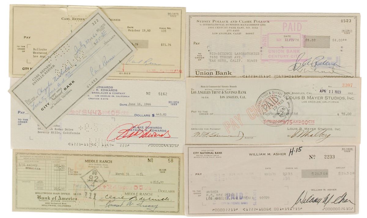 Collection of seven checks signed by well-known movie directors and producers, including: Irving Thalberg, Cecil B. DeMille, Sydney Pollack, Blake Edwards, William Asher, and Carl Reiner (2). In overall fine condition.