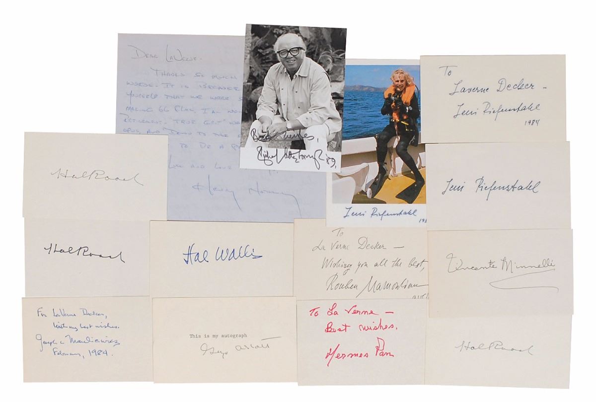 Collection of fourteen items, consisting almost entirely of off-white 5 x 3 cards, each signed in ink by a director, a few inscribed, including: Richard Attenborough (SP), Rouben Mamoulian, Joseph L. Mankiewicz, George Abbott, Vincente Minnelli, Hermes Pan, Henry Hathaway (ALS), Hal Roach (3), and Leni Riefenstahl (2 signatures and 1 SP). Also includes a signature from legendary producer Hal Wallis. In overall fine condition. Accompanied by the original mailing envelopes for the Roach and Riefenstahl signatures.