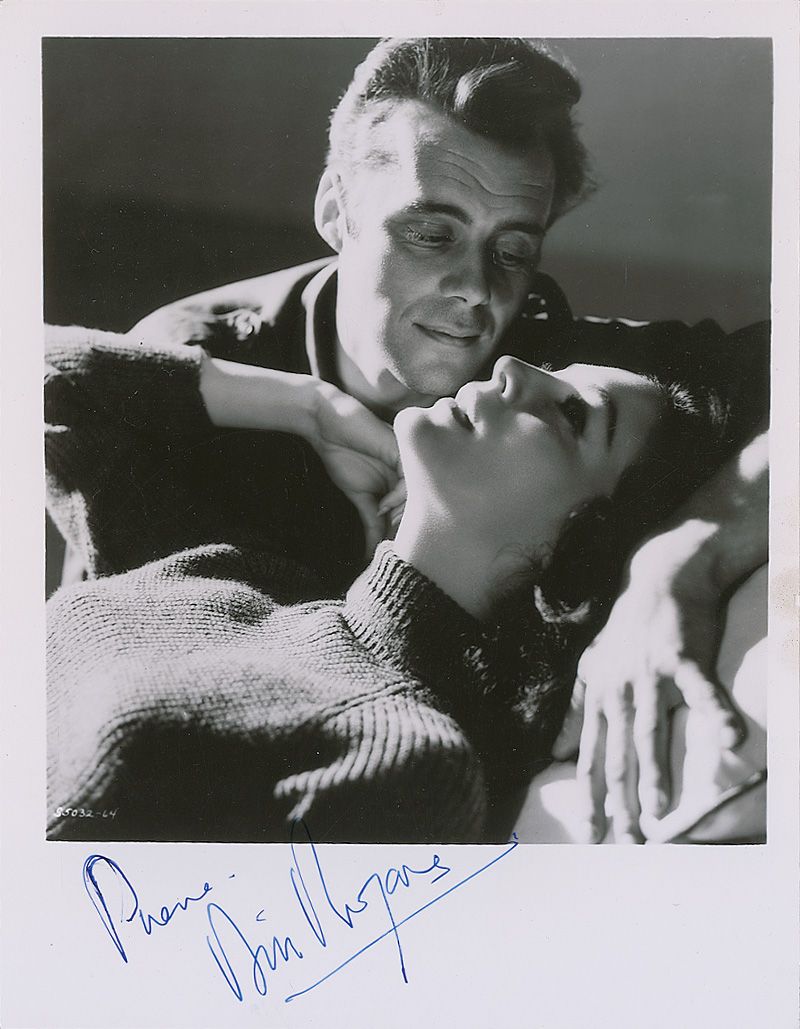 Fantastic glossy 8 x 10 photo of Bogarde with Ava Gardner in The Angel Wore Red, signed and inscribed in-person in blue ink “Pierre—Dirk Bogarde.” In fine condition, with a few light scattered creases and a light spot of irregular toning to the right border.