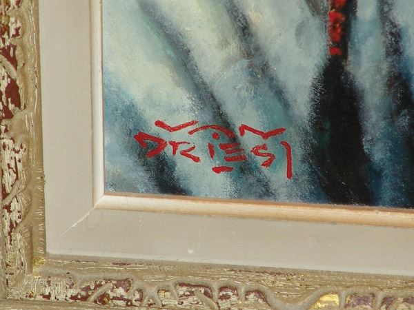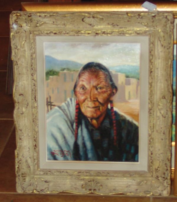 Striking, signed original oil on board showing a Taos man near the Pueblo. Very good condition, custom mounted and framed.Ca. 1980s14" x 11" (21" x 18")