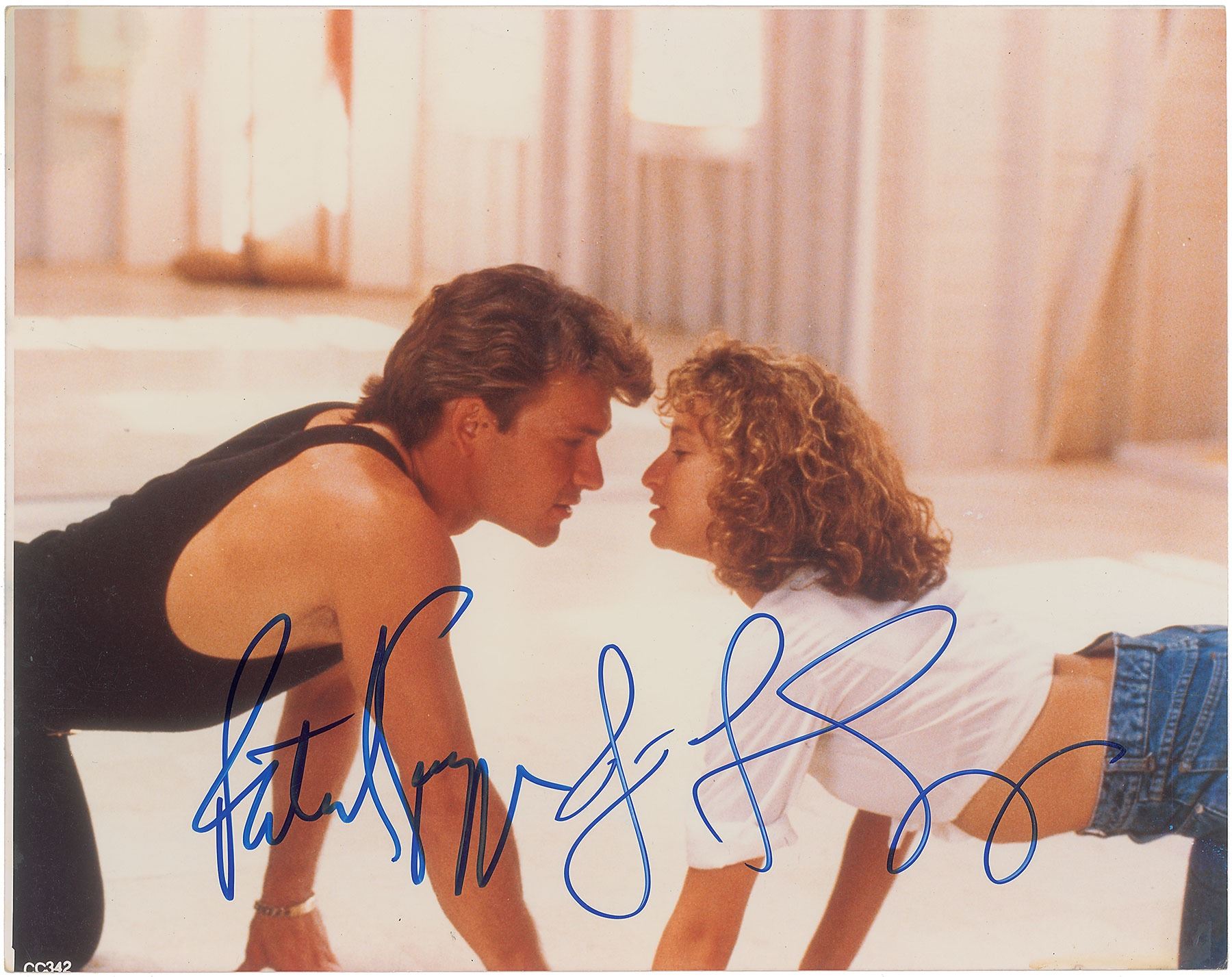Wonderful color glossy 10 x 8 photo of Johnny Castle and Frances 'Baby' Houseman during a memorable scene from the 1987 film Dirty Dancing, signed in blue felt tip by Patrick Swayze and Jennifer Grey. In very good to fine condition, with two light vertical bends.