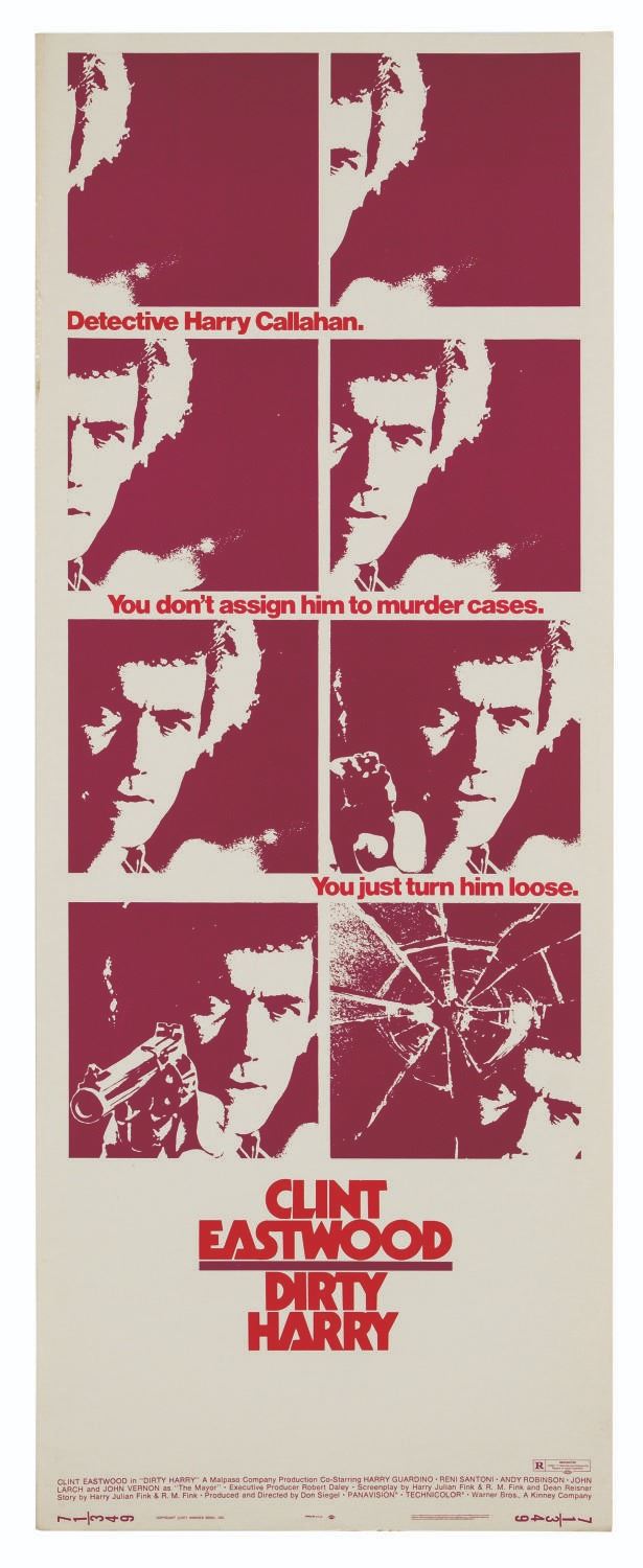 (WB, 1971) An original U.S. insert poster for the brutal Don Siegel neo-noir thriller, Dirty Harry. Featuring Clint Eastwood in his breakthrough performance as Harry Callahan, the poster depicts the detective firing his .44 Magnum in a series of stylized film frames. Measuring 36"x14", the poster is in very good condition with some upper left edge wrinkling.