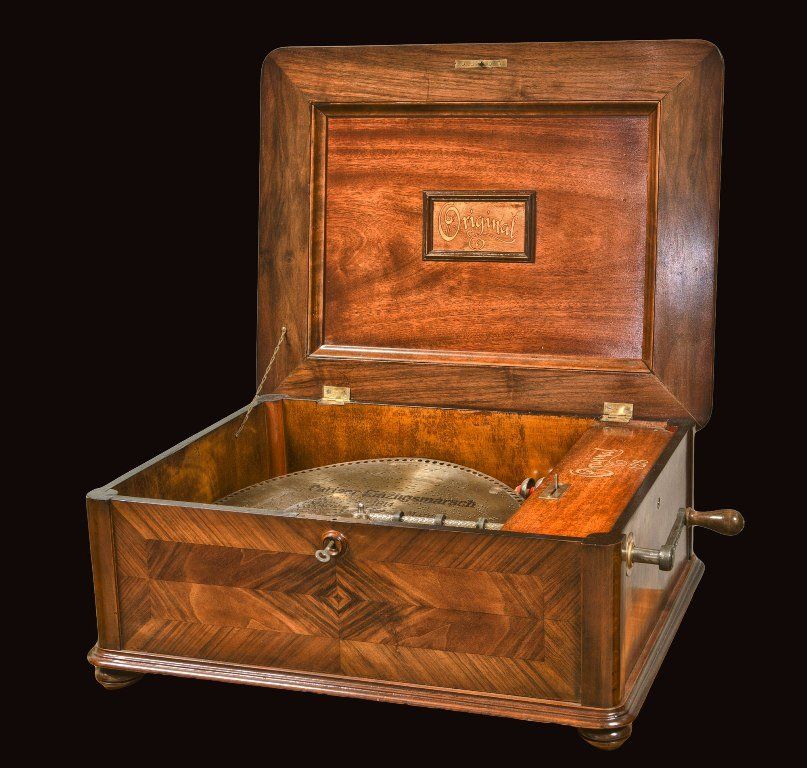 Plattenspieldose «Original» Nr. 128. Sehr seltenes Tischmodell von Lochmann mit Untersatz. Doppelkamm mit 120 Zähnen; 8 Glockenstäbe; Preis 1904: 192 Mark. Mit 8 Platten (Ø43cm). Museumsqualität. 66 x 50,5 x 26cm. Original Musikwerke Paul Lochmann, Leipzig, Germany, circa 1904.