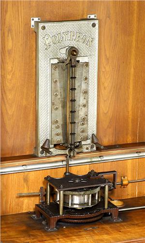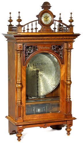 "Polyphon Nr. 105 U", um 1900 Plattenspielwerk der "Polyphon Musikwerke, Leipzig", für 62,5-cm-Blechplatten, mit Münzbetrieb, 159-toniger Doppelkamm (komplett!), Nußbaumgehäuse: 76 x 39 x 158 cm, Original-Galerie mit eingebauter Uhr und 10 Platten! - Ein super Exponat und Sammlungsstück!