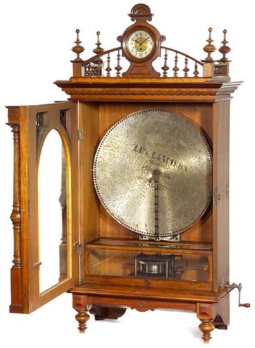 Disc Musical Box "Polyphon No. 105 U", c. 1900 For 24 1/2 in. discs. Manufactured by "Polyphon Musikwerke, Leipzig", coin-operated, 159 teeth in upright duplex comb (complete!), walnut case, original gallery with clock! With 10 discs! - A superb collector's item and exhibition piece!<Br>