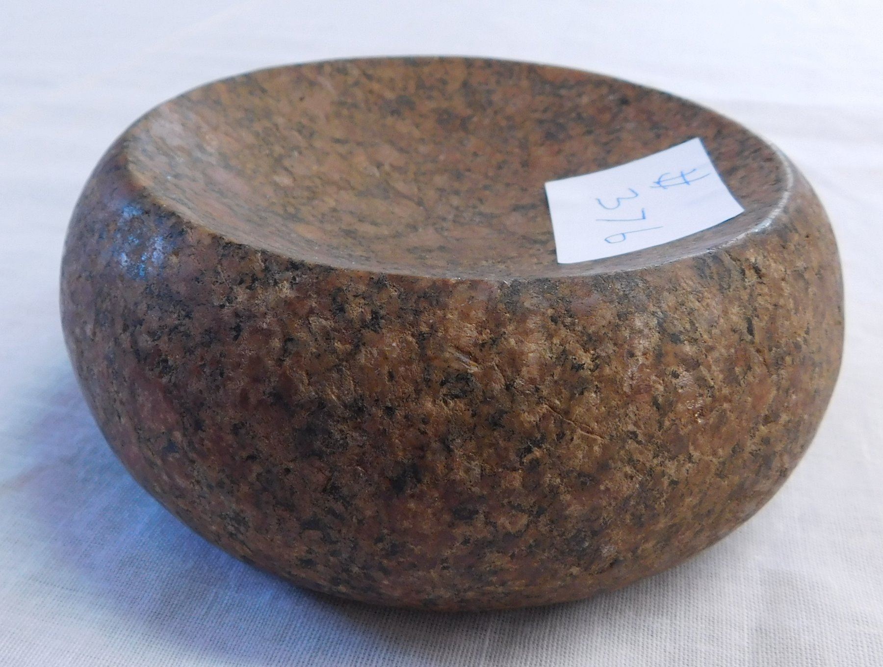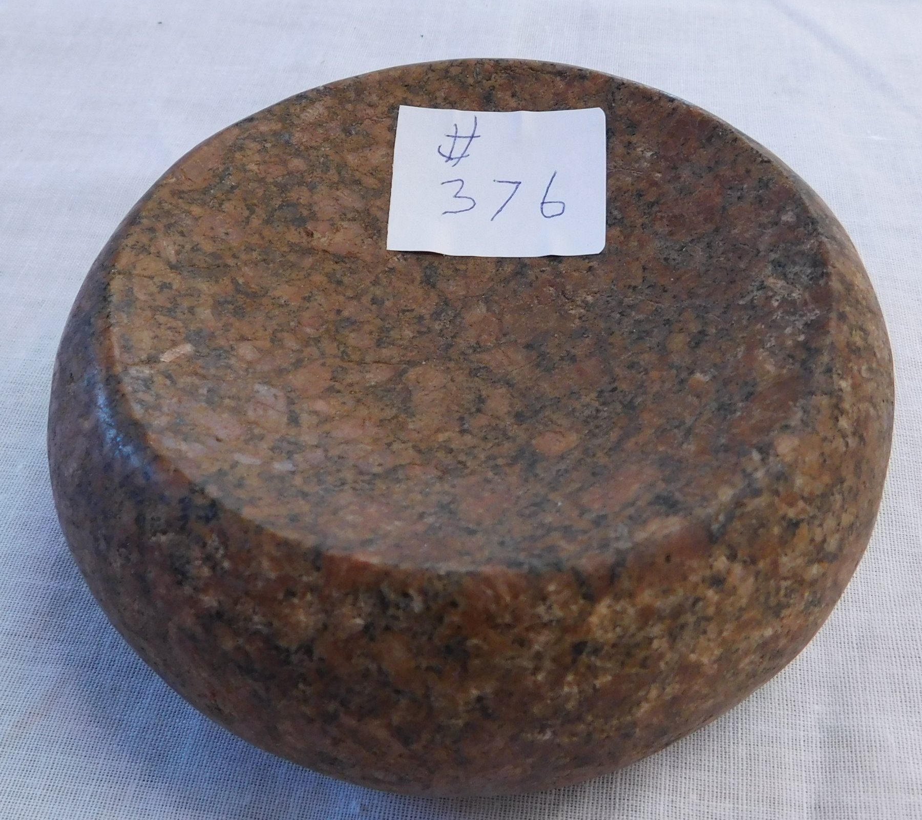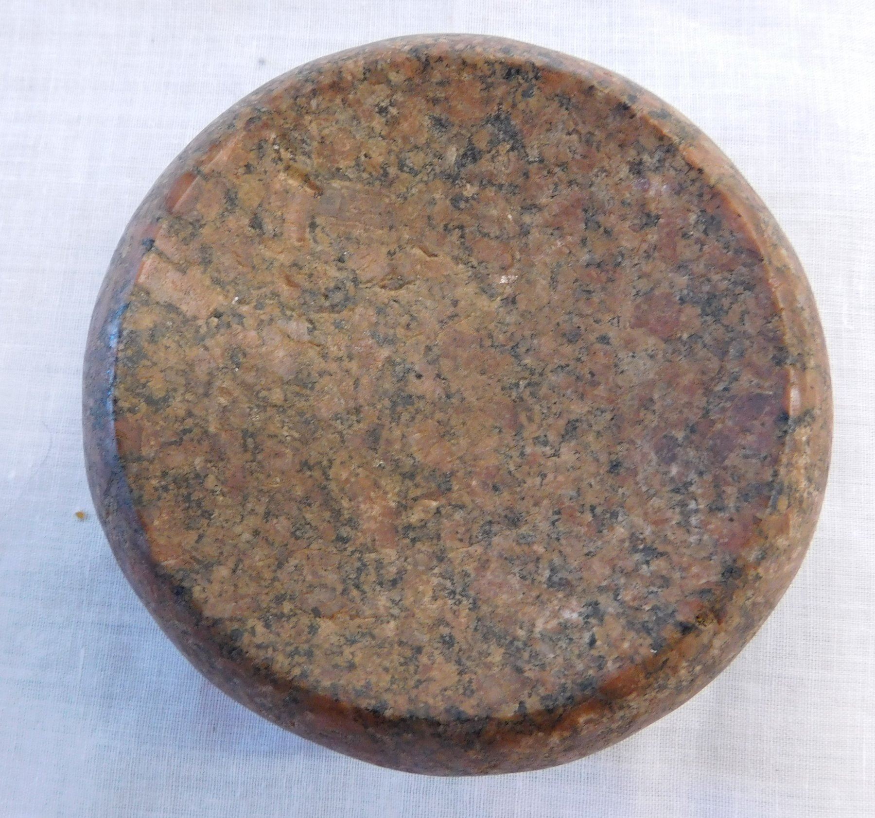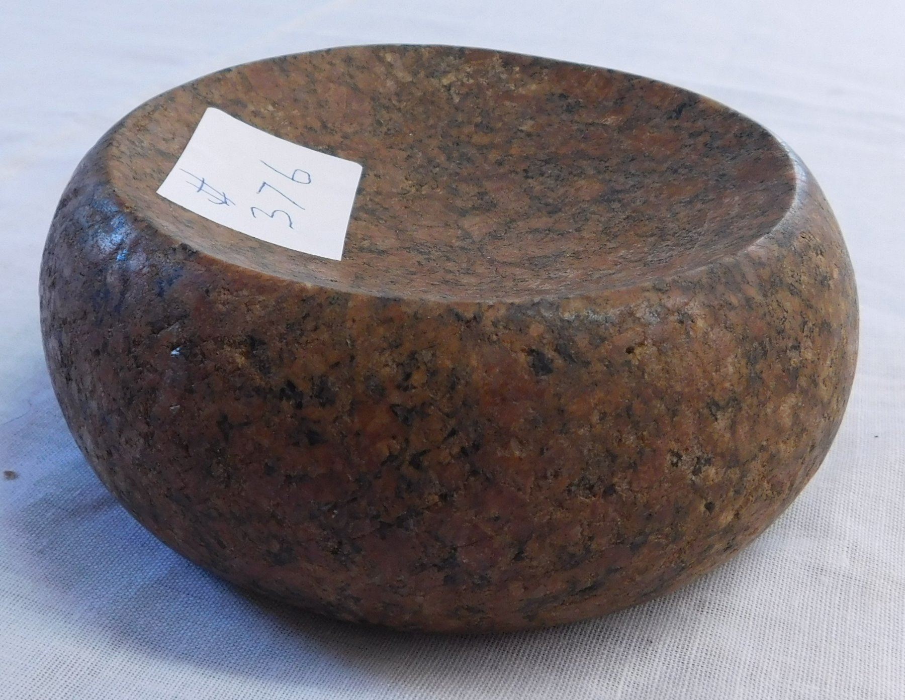 Discoidal Game Stone, pre-historic item. Made of red granite, the item measures 4 1/4" x 1 1/2". Cook County, Illinois. Deep cups. Condition: Good, see images. Shipping: $16.50 w/insurance and signature.