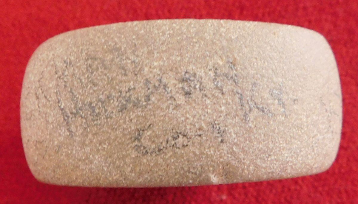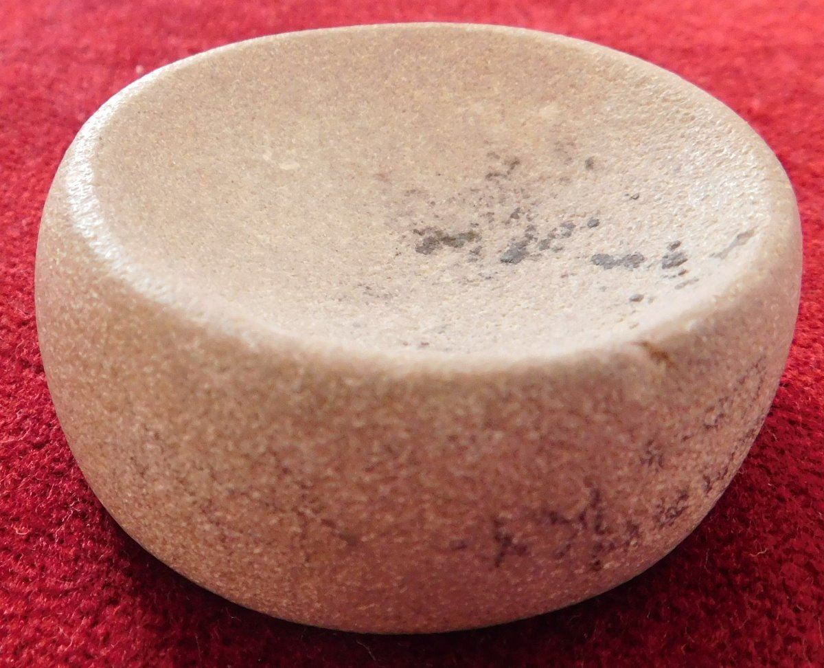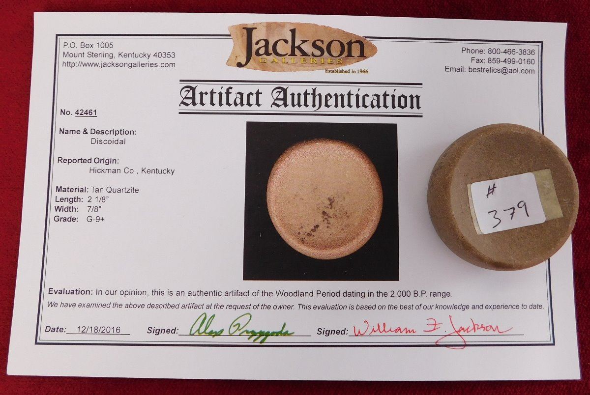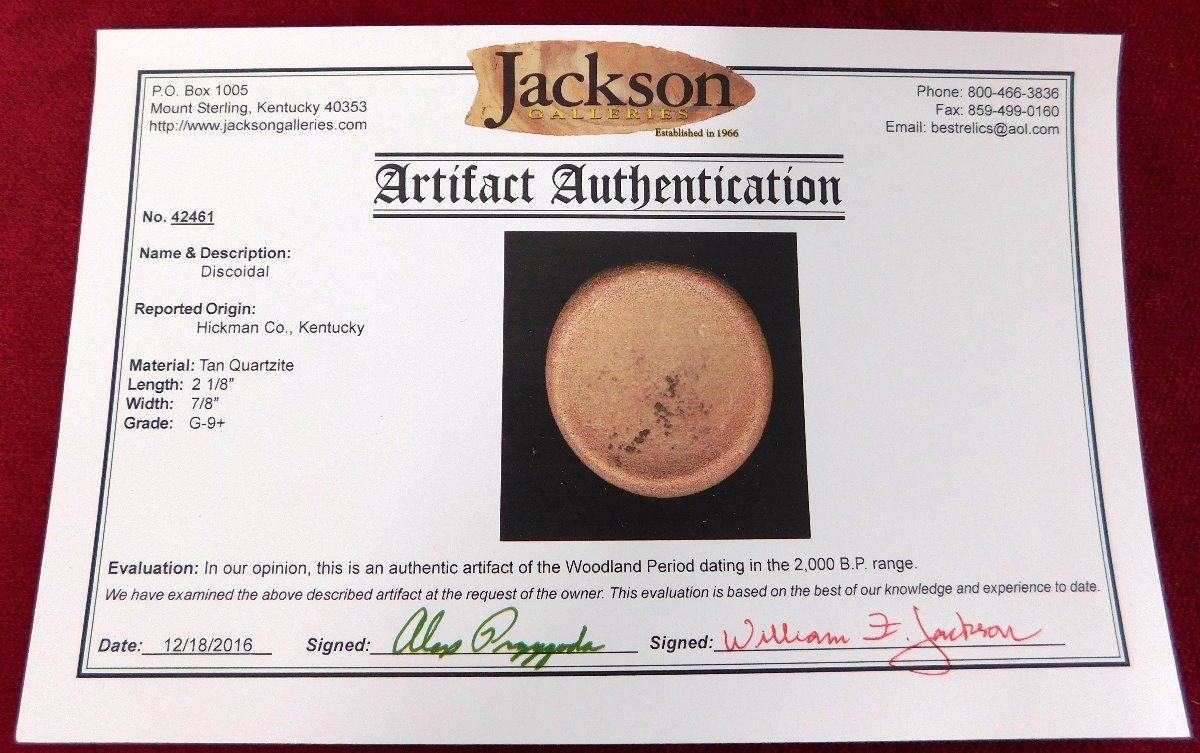 Discoidal Stone w/Jackson COA, c. 2000 yrs B.P. Made of tan quartzite, the item is 2 1/8" x 7/8". Hickman County, Kentucky. Museum quality quartz discoidal. Condition: Grade 9 plus, see images. Shipping: $15.50 w/insurance and signature.