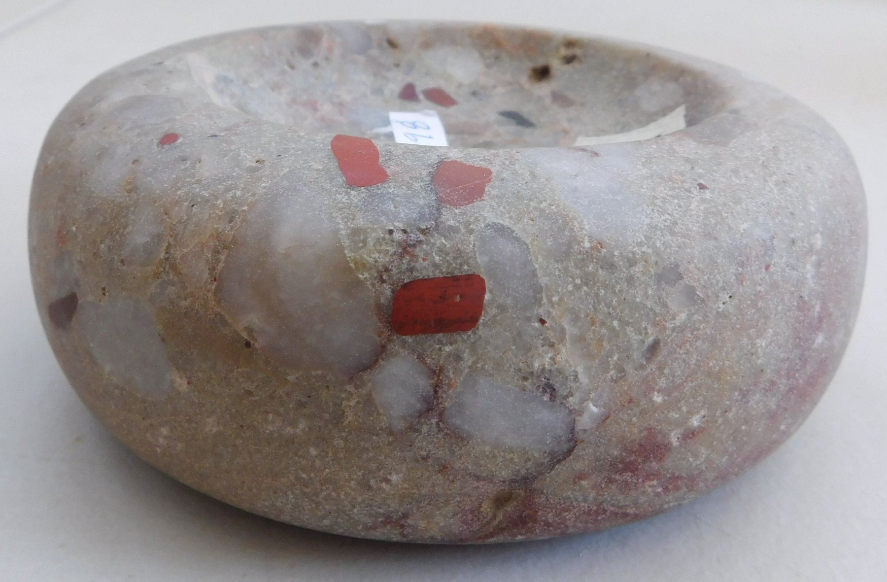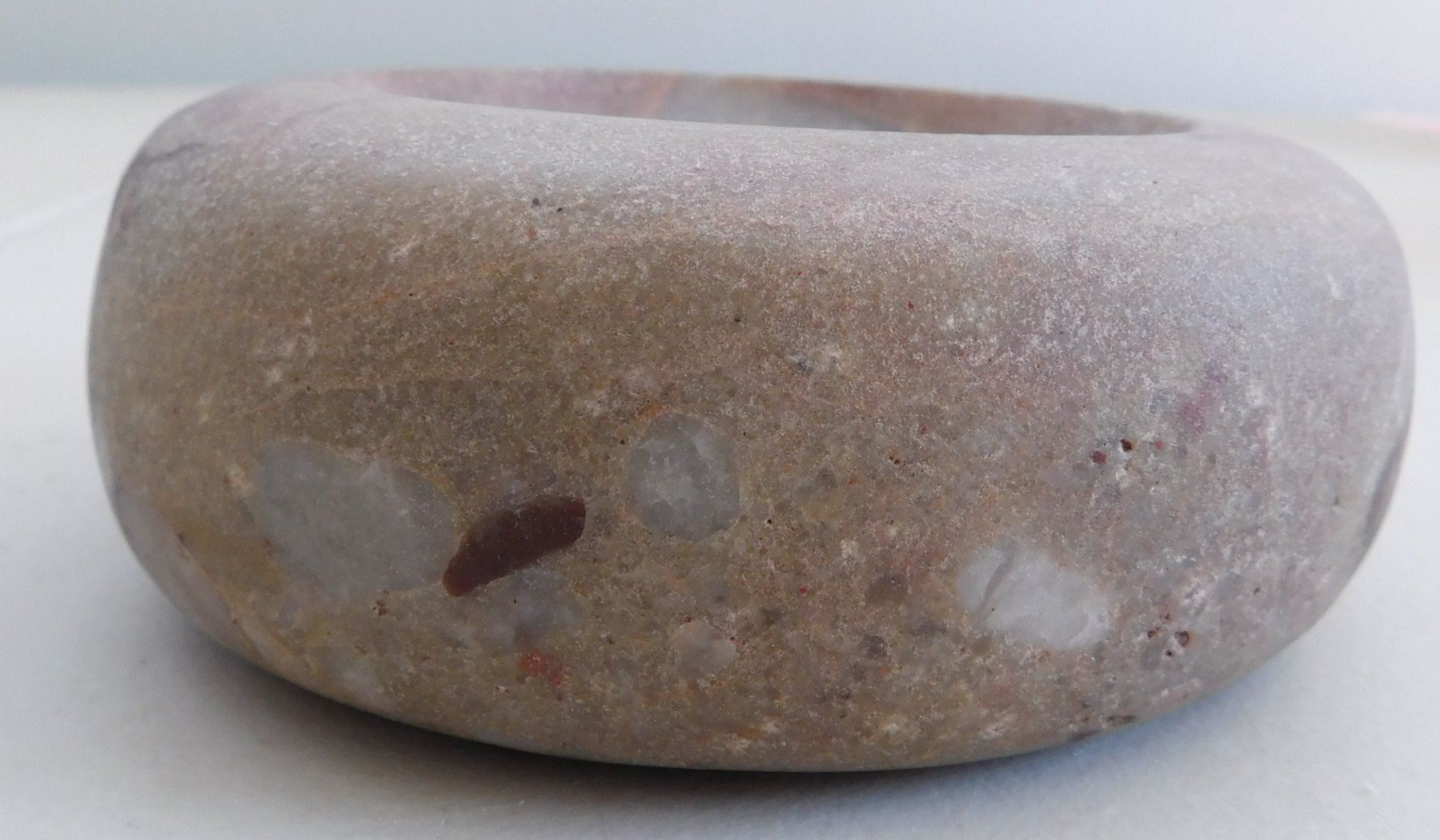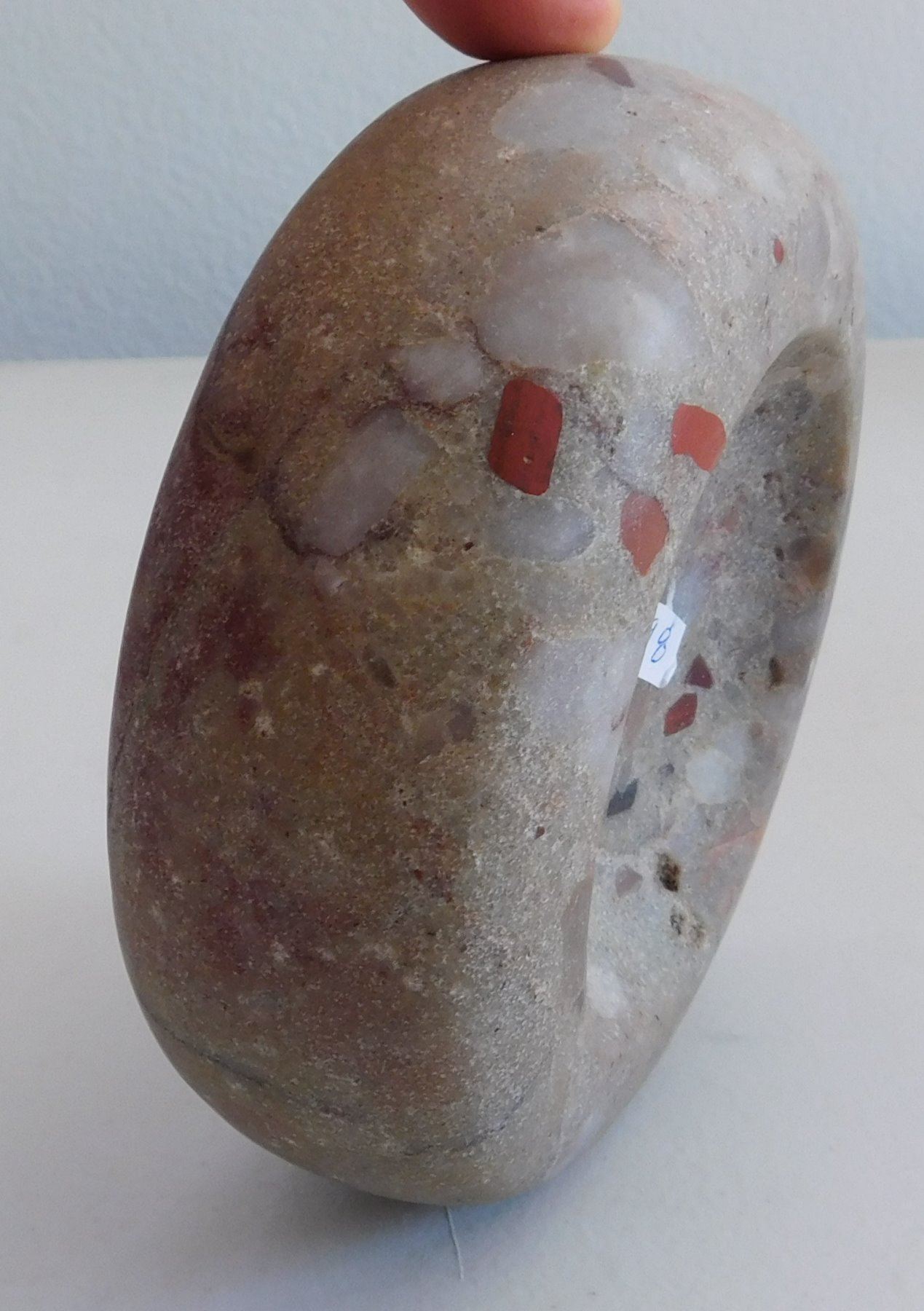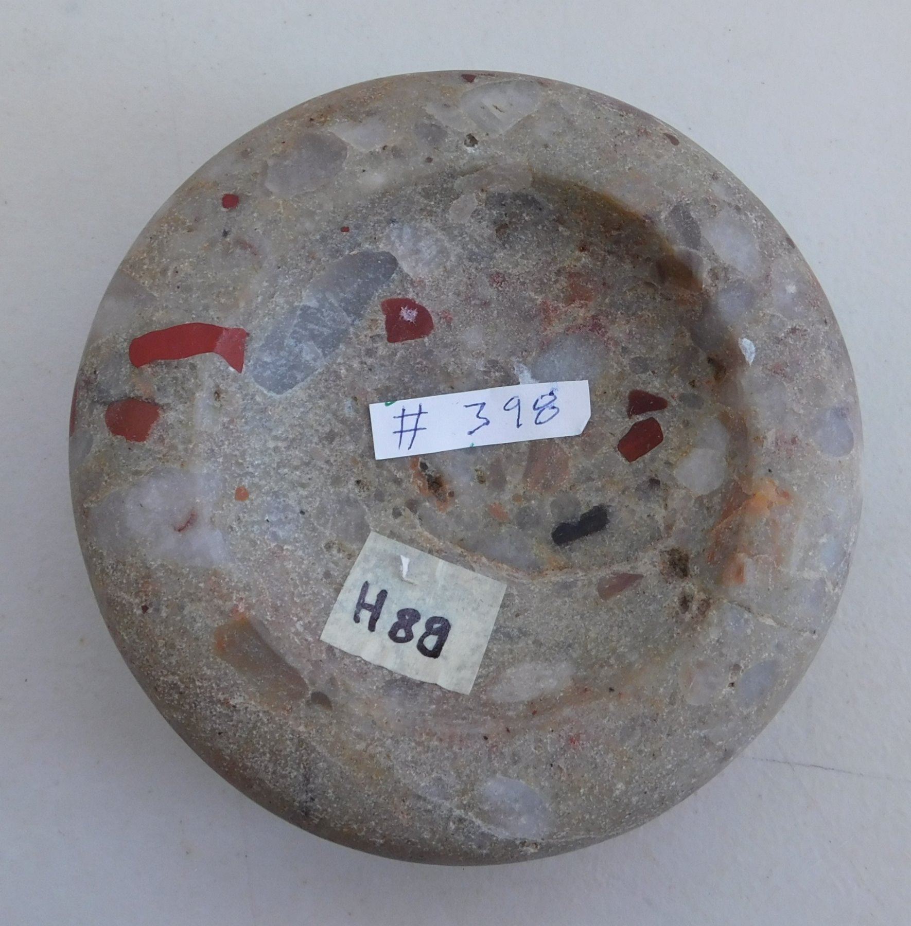 Discoidal Stone, archaic period. Made of quartz puddingstone, the item measures 5" x 1 3/4". Illinois. Colorful discoidal. Condition: Good, see images. Shipping: $25.50 w/insurance and signature.