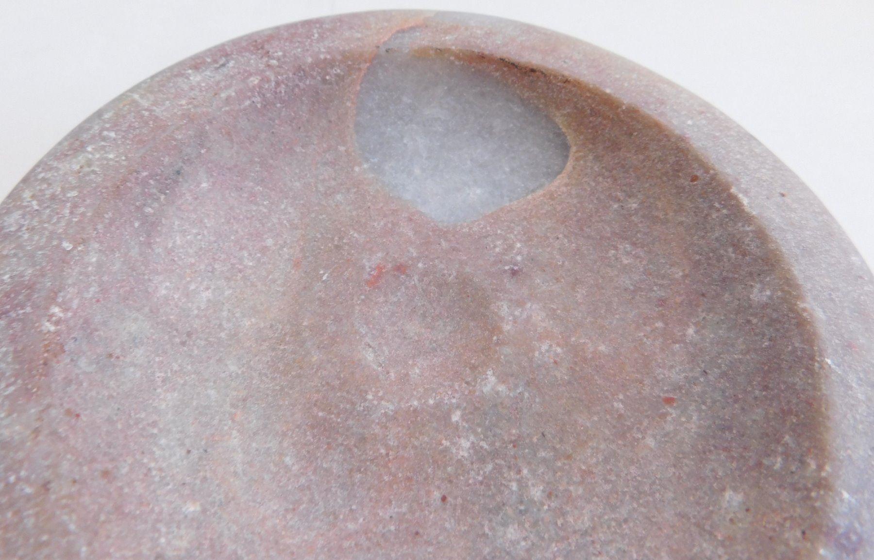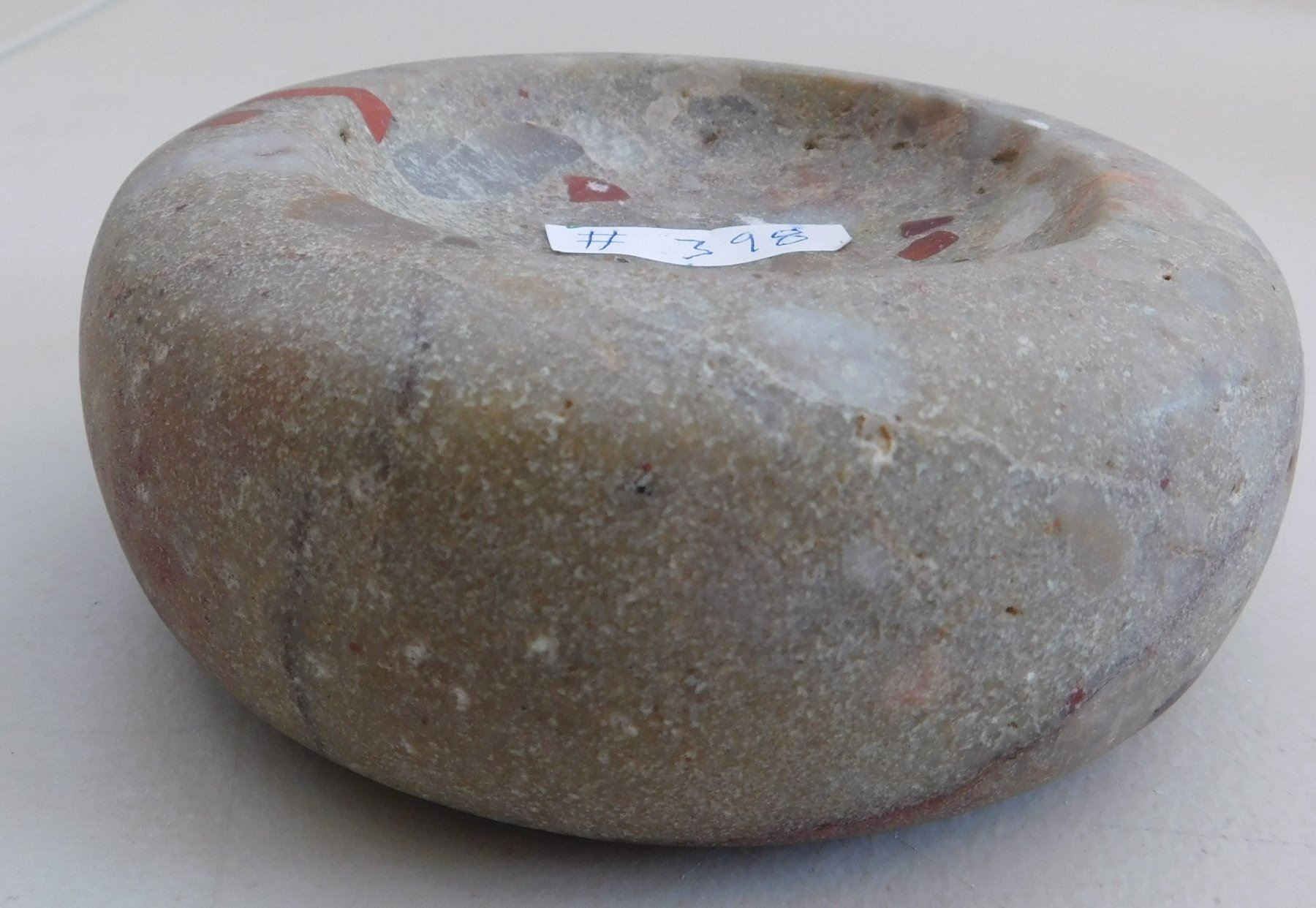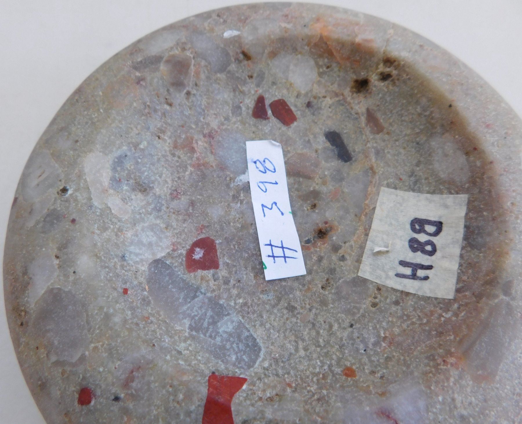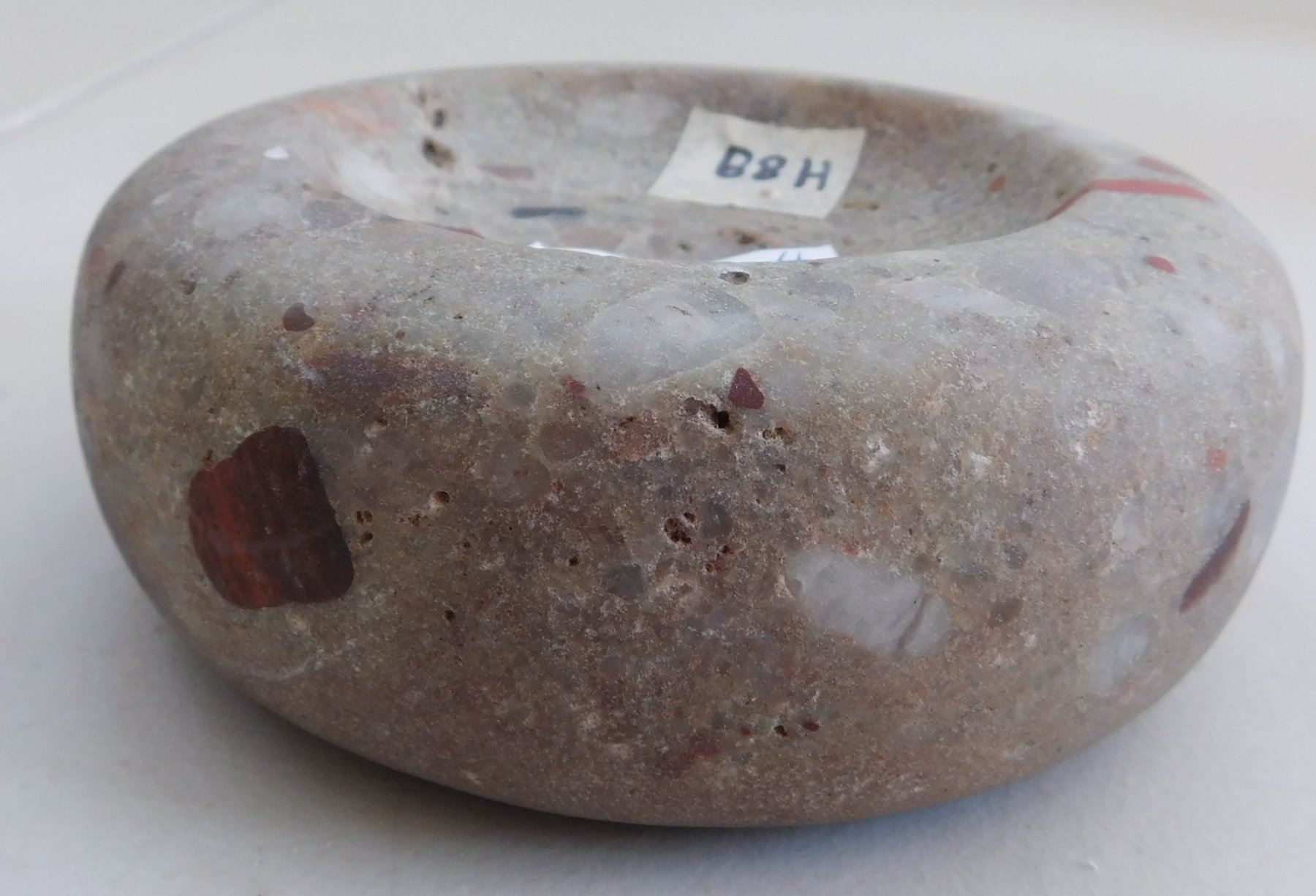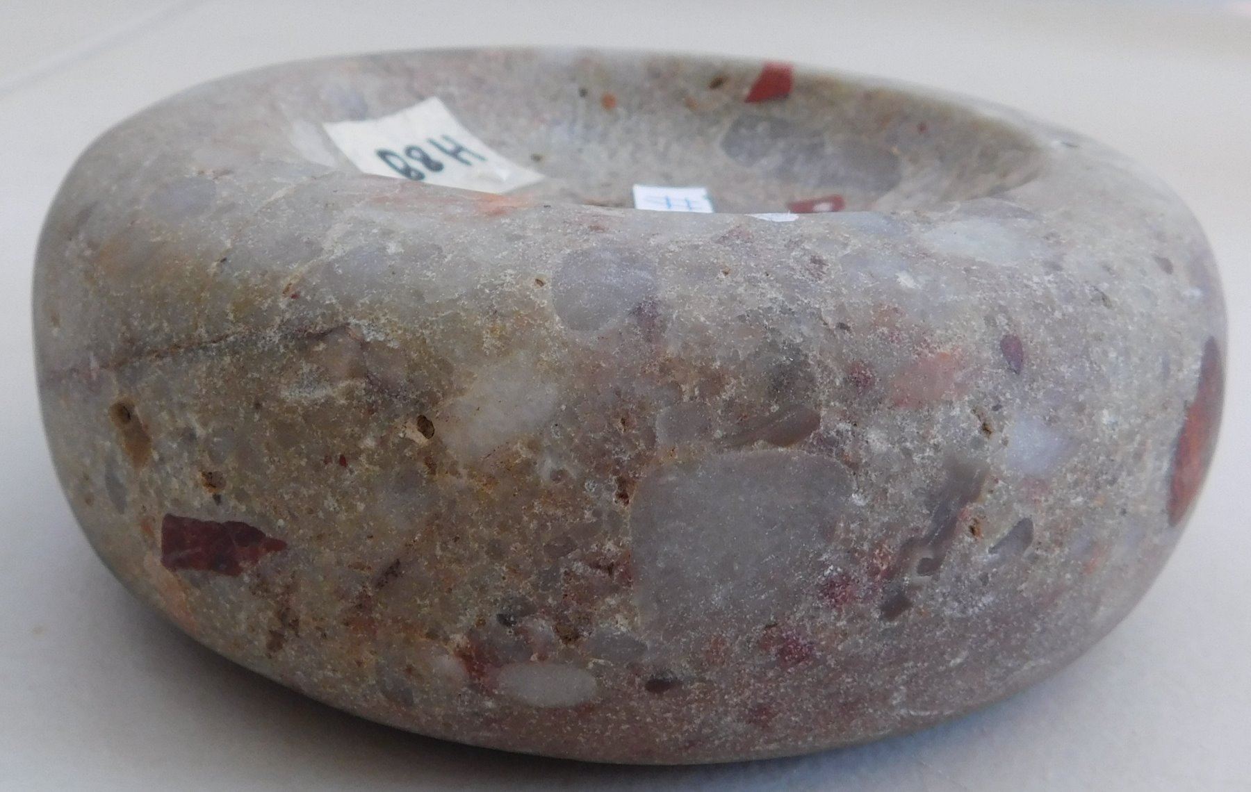 Discoidal Stone, archaic period. Made of quartz puddingstone, the item measures 5" x 1 3/4". Illinois. Colorful discoidal. Condition: Good, see images. Shipping: $25.50 w/insurance and signature.
