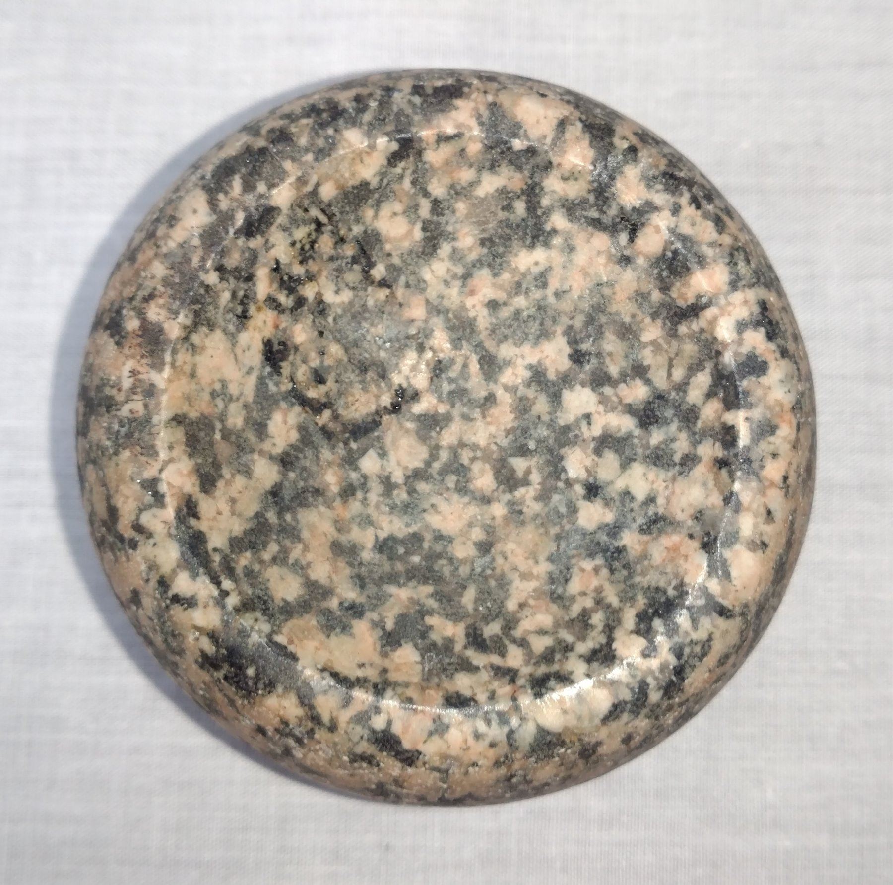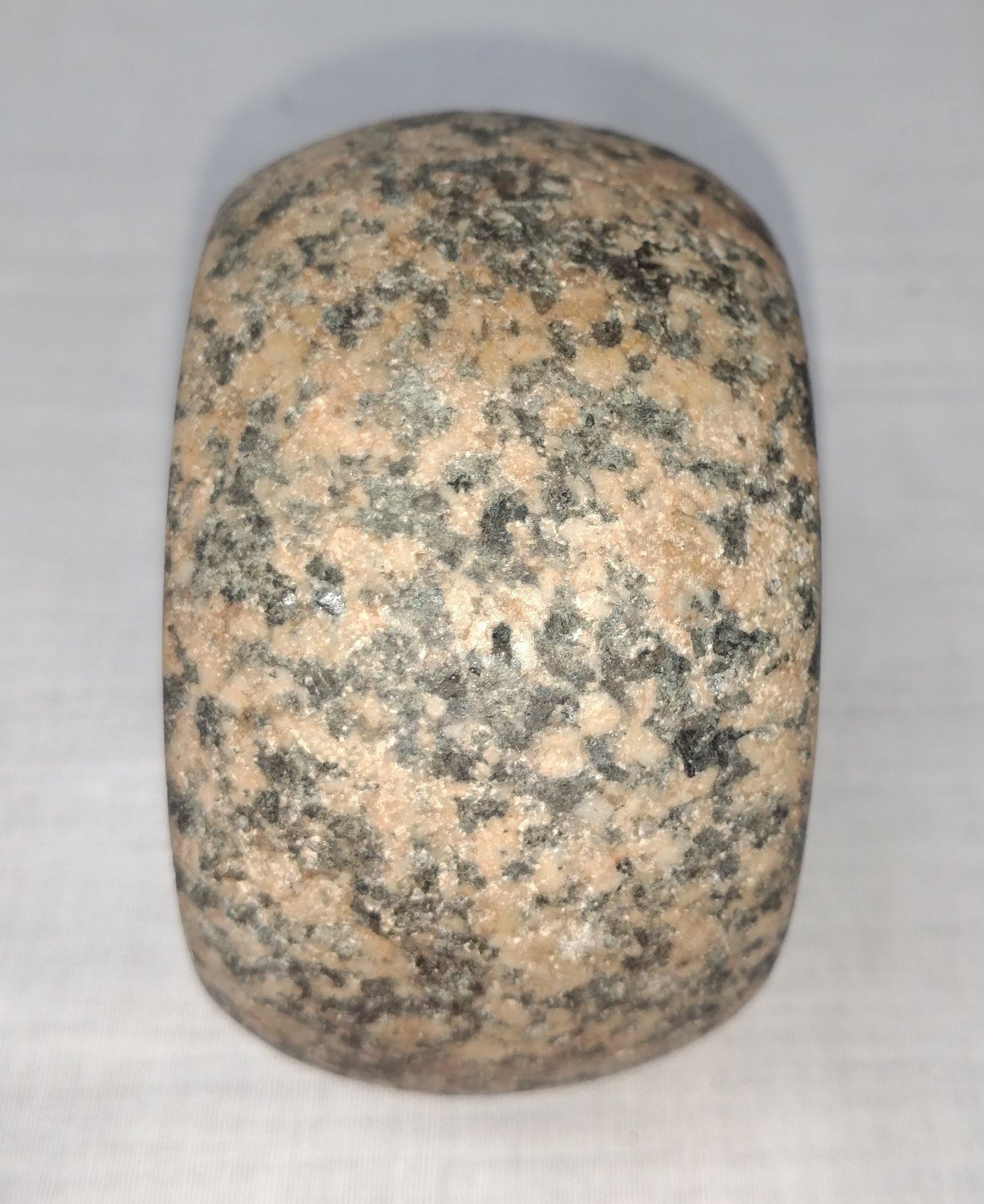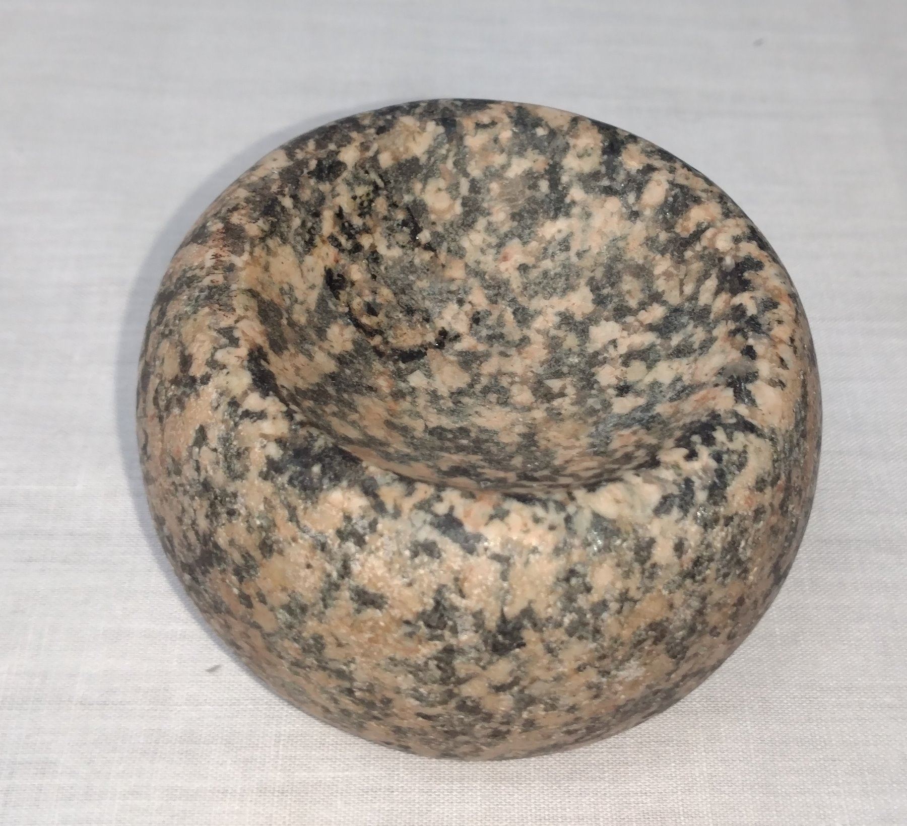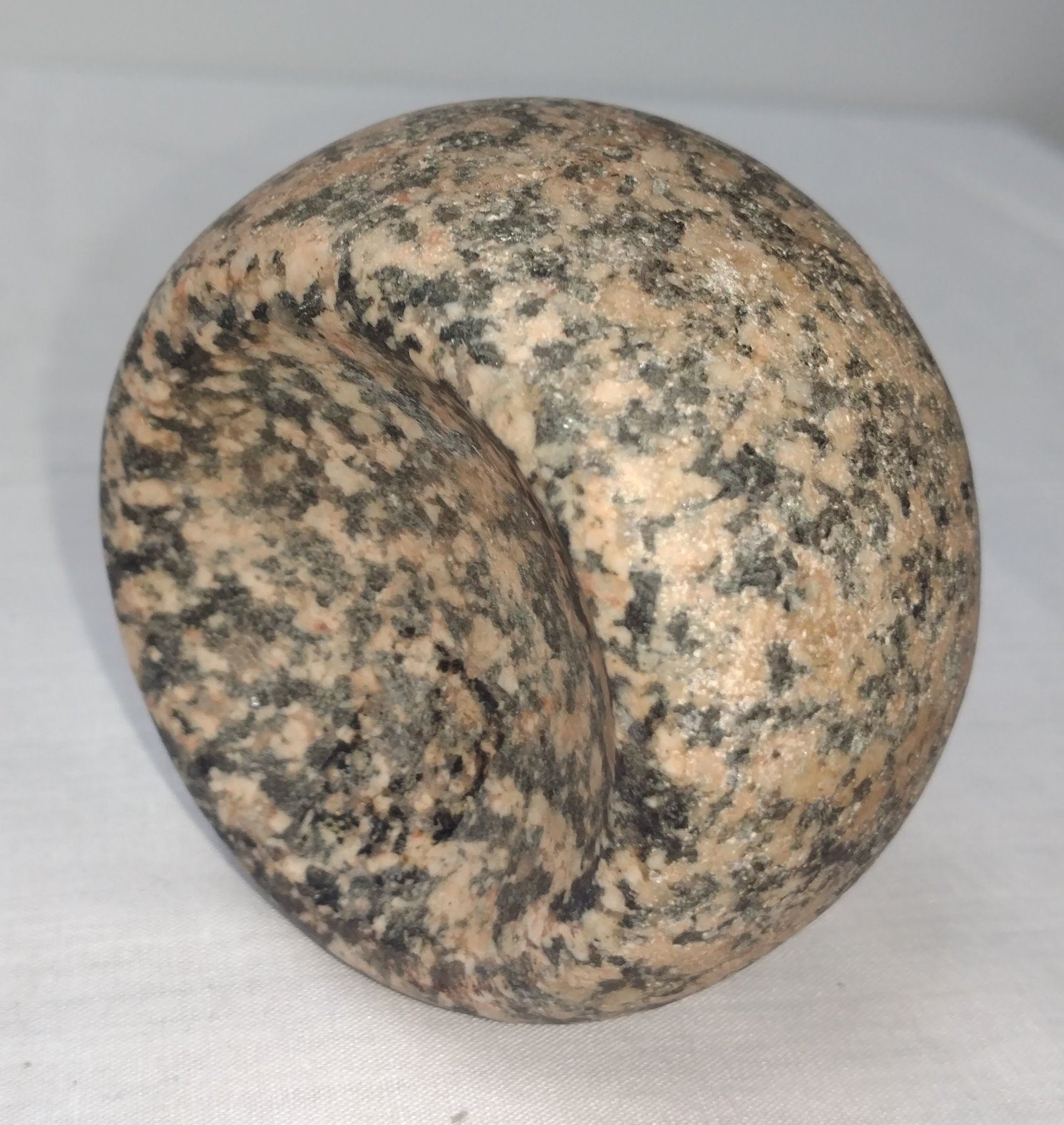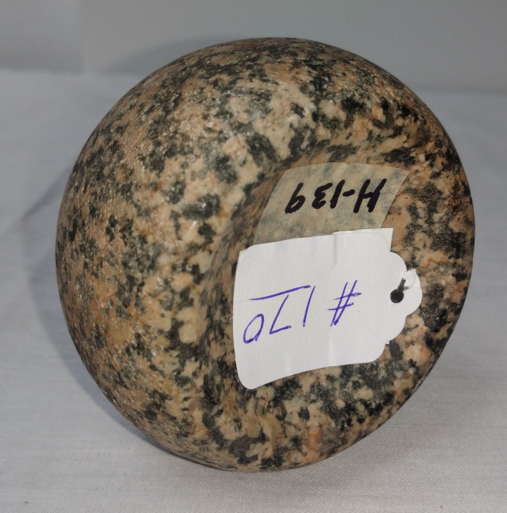 Discoidal Stone, pre-historic item, made of black and white granite, the item measures 3" x 1 3/4". Pike County, Illinois. Deep cups. Condition: Good, see images. Shipping: $15.50 w/insurance and signature.