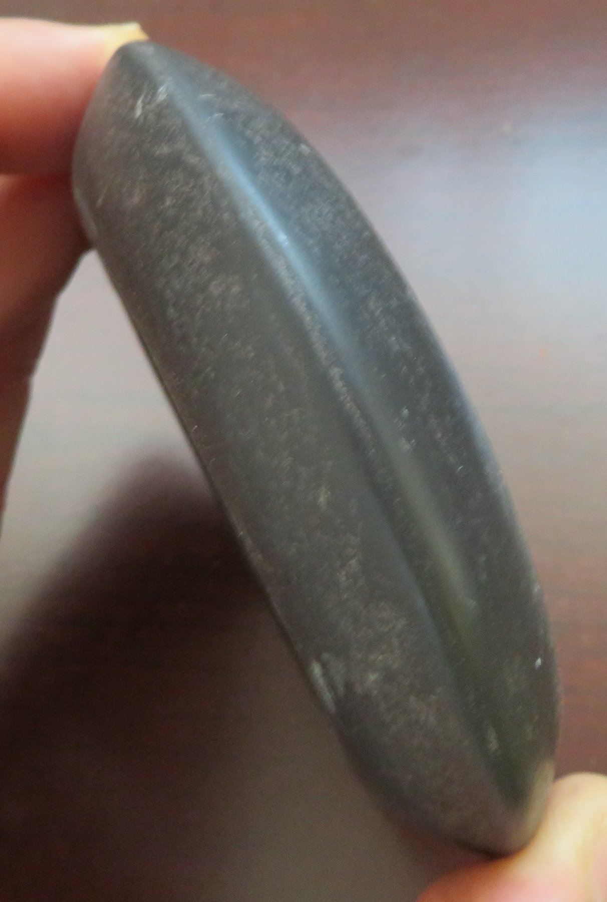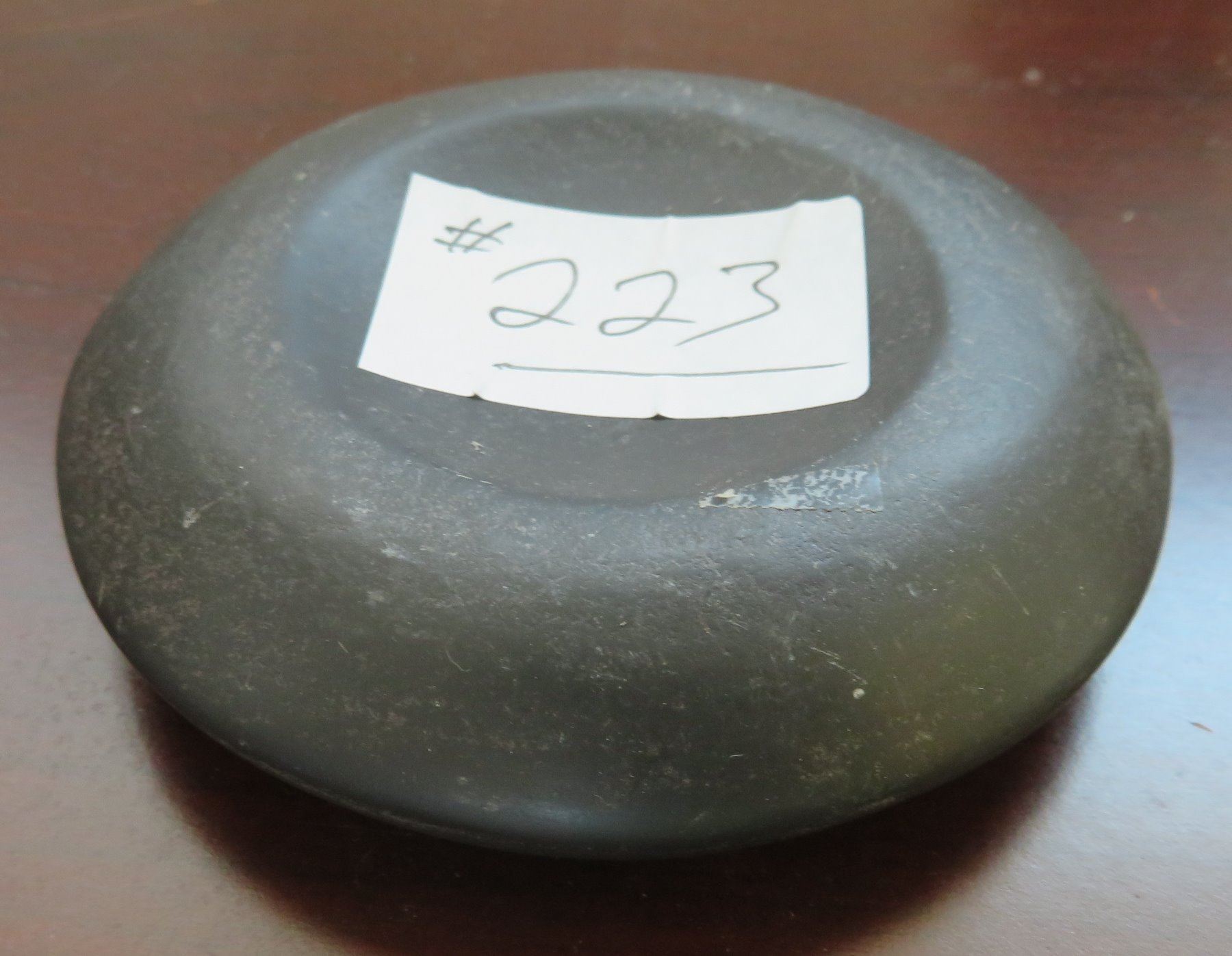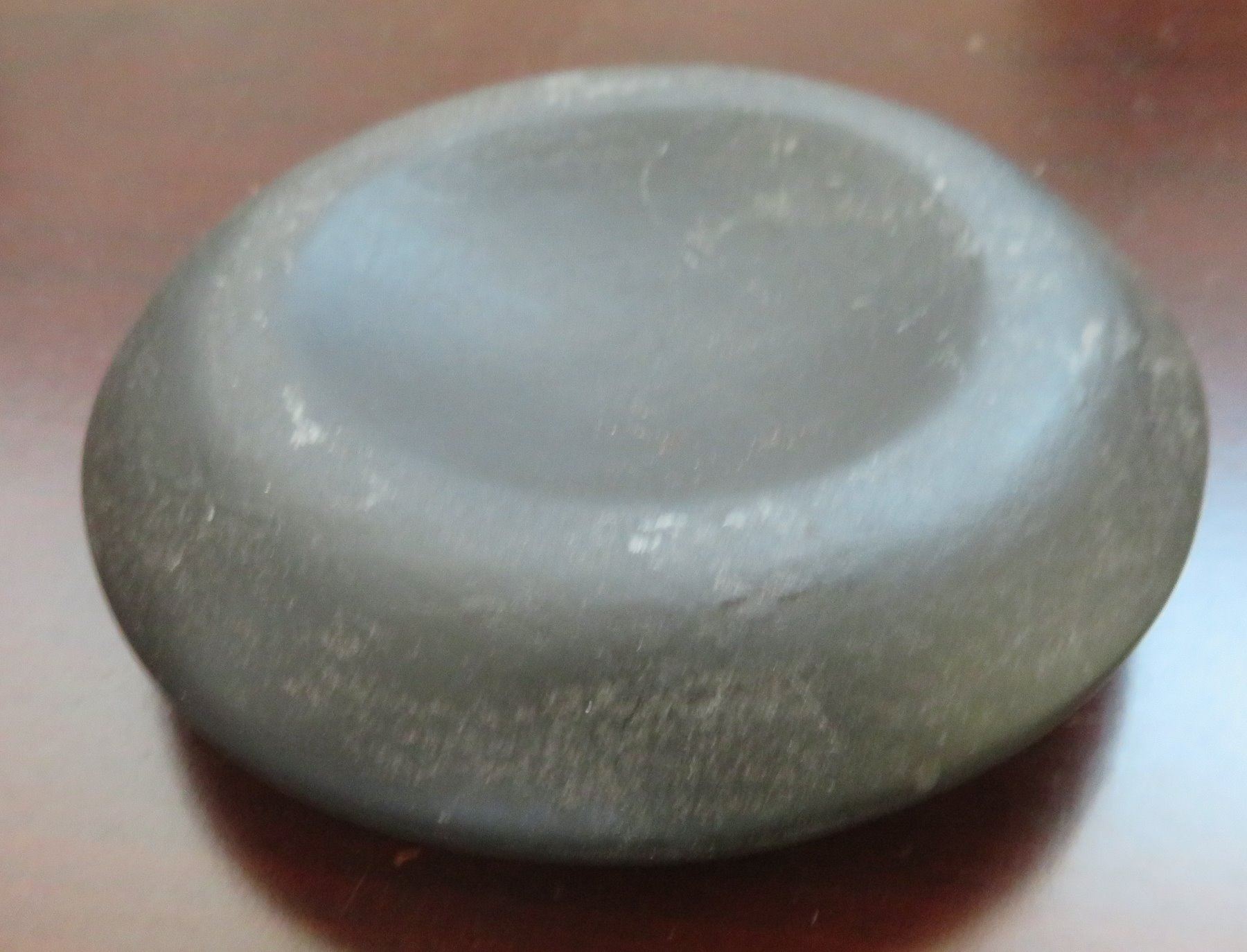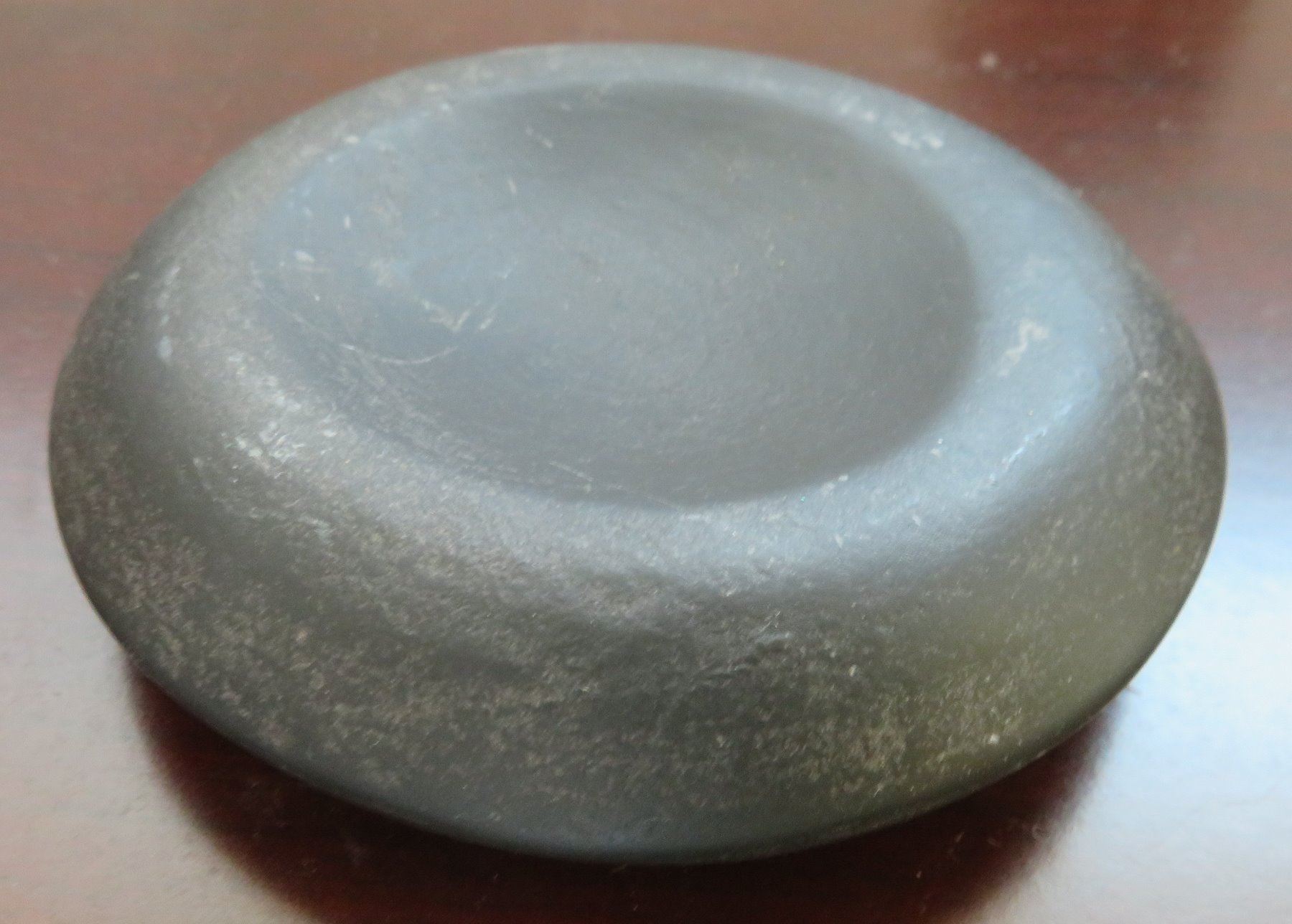 Discoidal Stone, pre-historic item. Made of basalt, the item measures 3 1/2" x 1". Lincoln County, Missouri. Polished black. Condition: Good, see images. Shipping: $16.50 w/insurance and signature.
