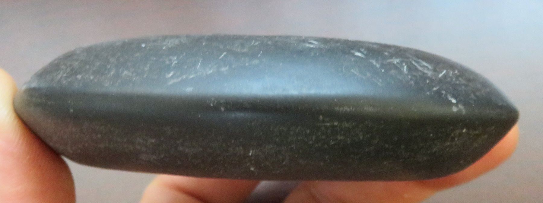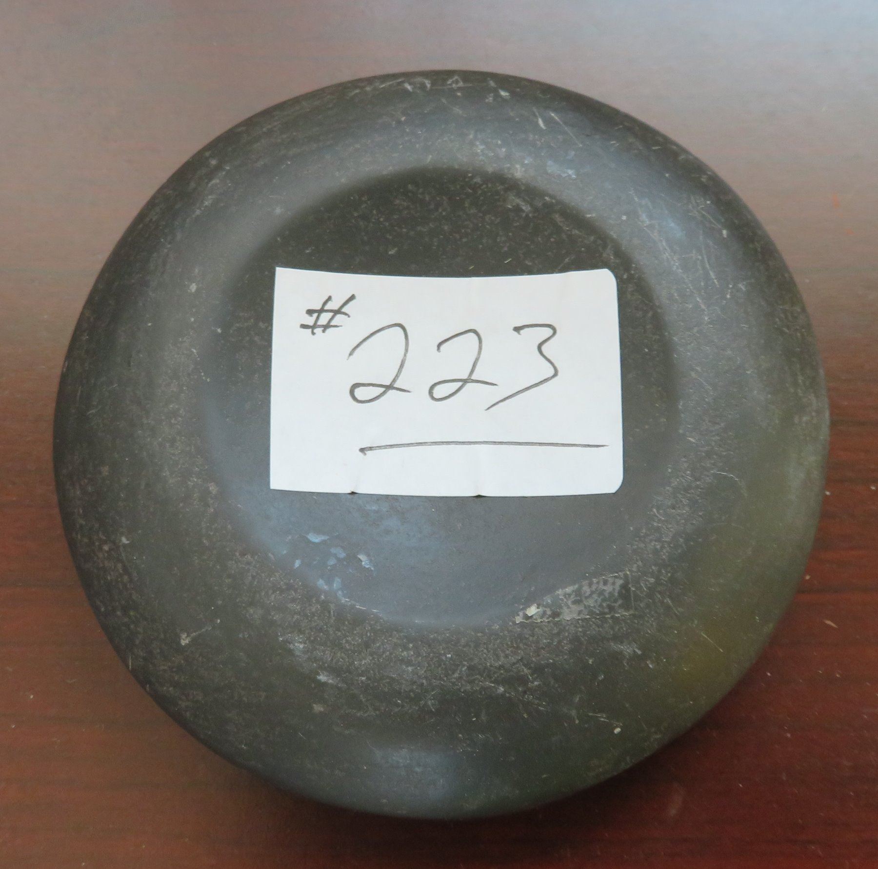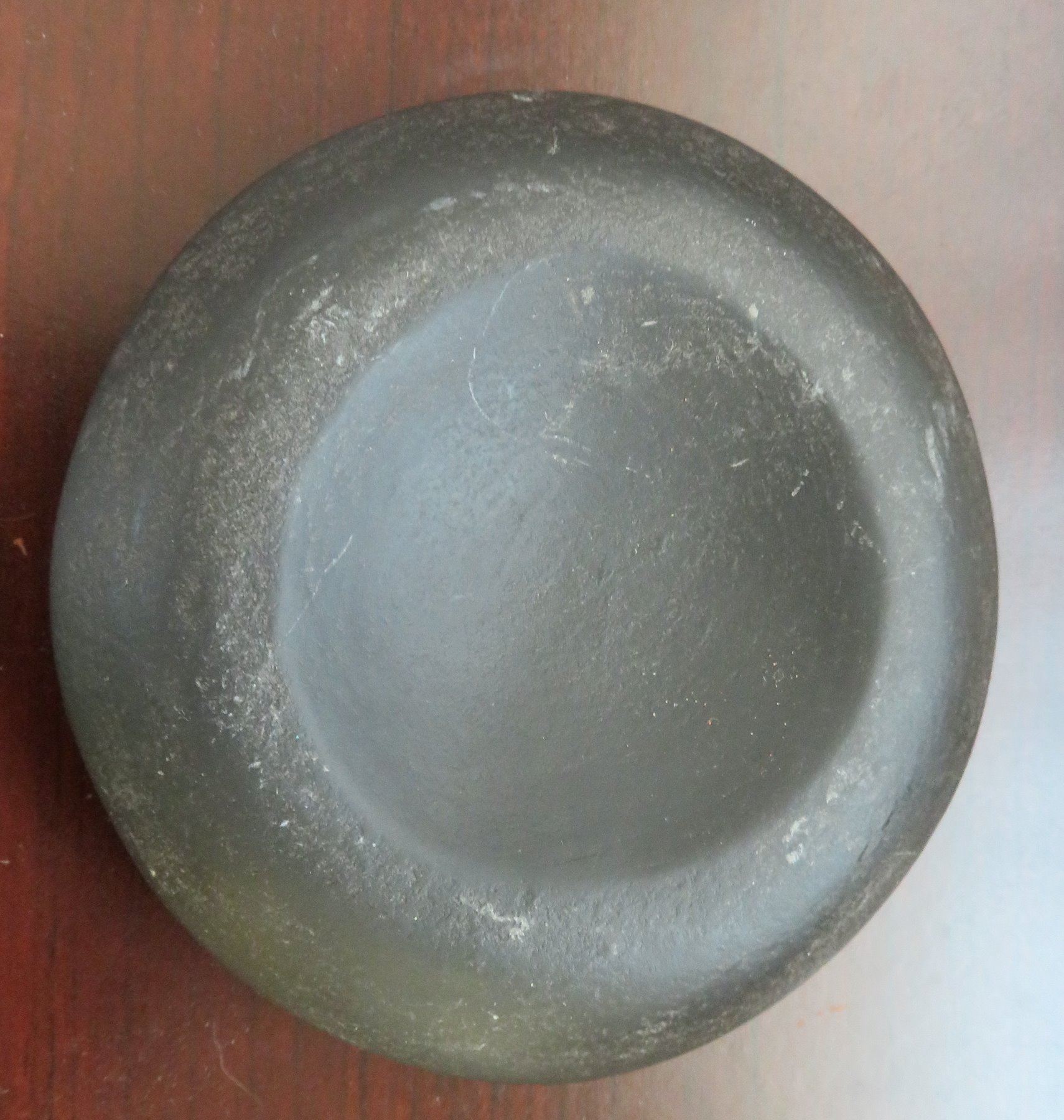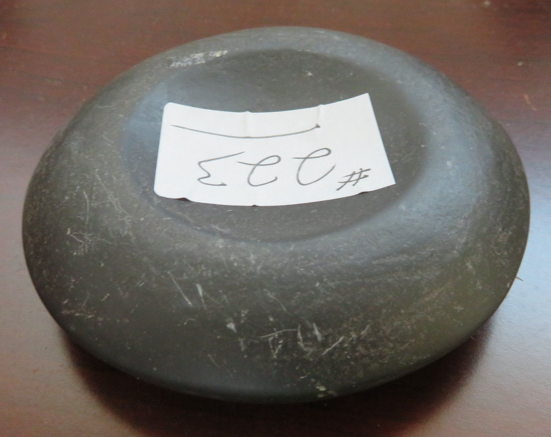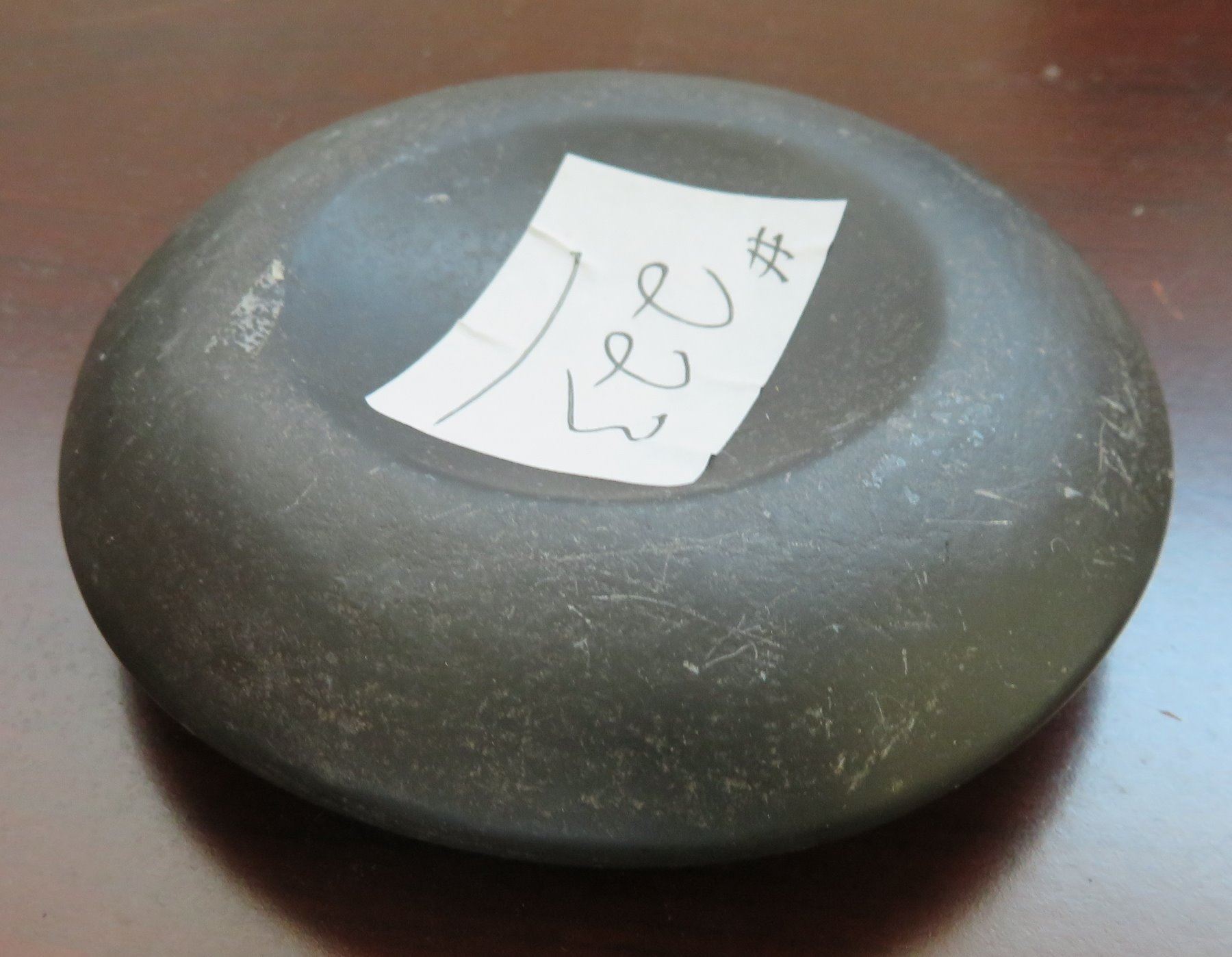 Discoidal Stone, pre-historic item. Made of basalt, the item measures 3 1/2" x 1". Lincoln County, Missouri. Polished black. Condition: Good, see images. Shipping: $16.50 w/insurance and signature.