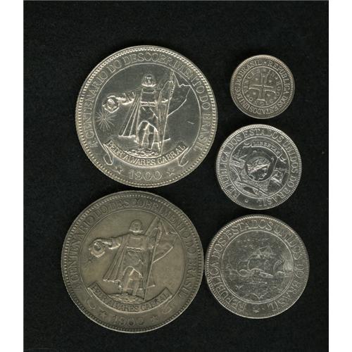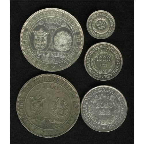 <B>Discovery Commemoratives 1900, </B></I>the complete set of these silver types struck to mark the 400th anniversary of the discovery of Brazil by Cabral: KM499 400 Reis, cleaned AU with hairlines, KM500 1000 Reis, AU, harshly cleaned, KM501 2000 Reis, VF-XF, heavily cleaned with small surface marks, KM502.1 4000 Reis 16 rays, sharp AU-UNC, lightly dipped but quite attractive, and KM502.2 4000 Reis 20 rays, toned XF-AU. <B>Sold as is, no return lot.</B></I><BR><I>From the Blue Ridge Collection</B></I><BR><BR><b>Shipping:</b> Coin/Currency (<a target="_blank" href="http://www.heritageauctions.com/common/shipping.php">view shipping information</a>)