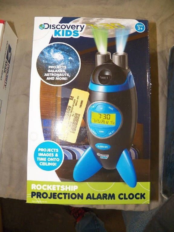 This rocket-shaped timepiece projects a digital clock display against detailed galactic images on any wall or ceiling