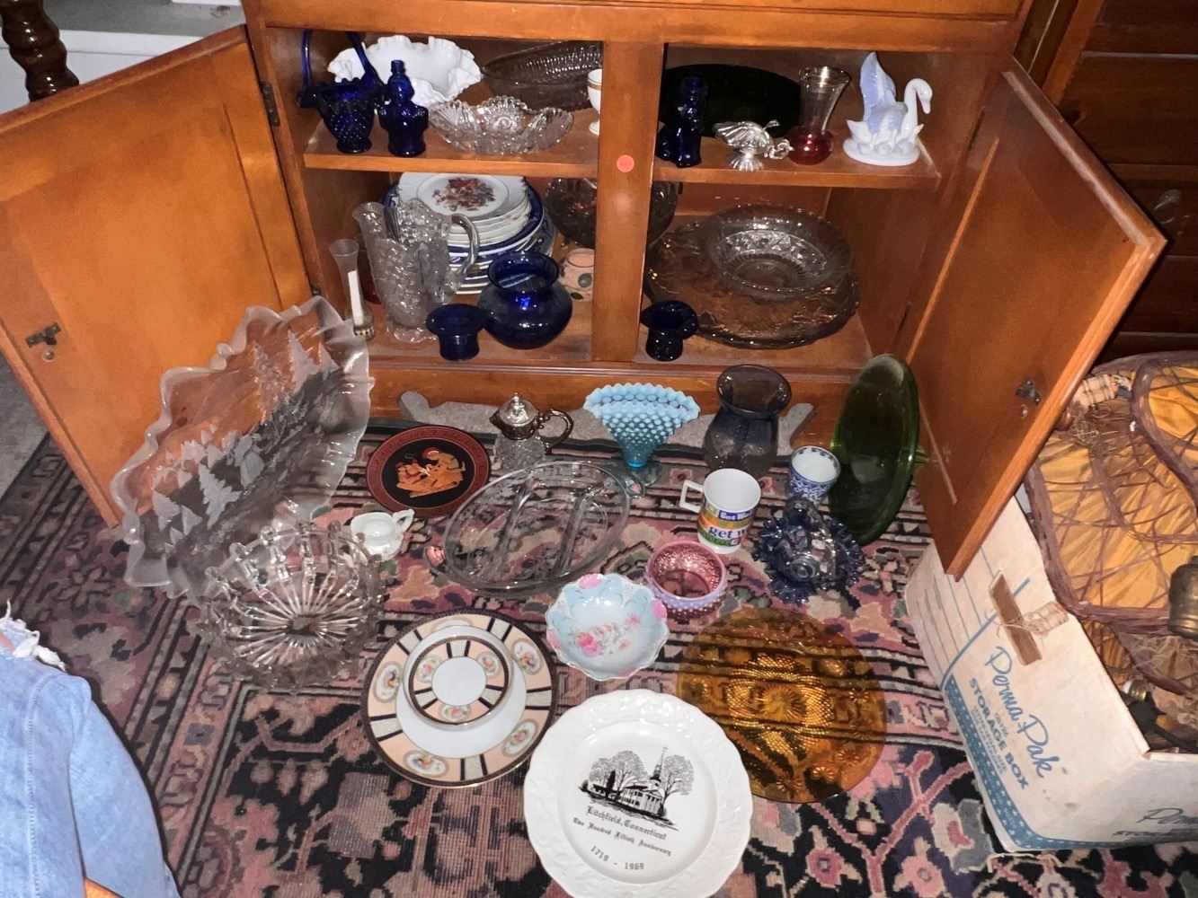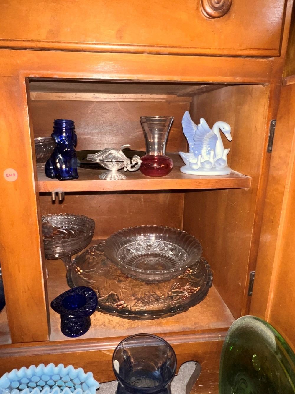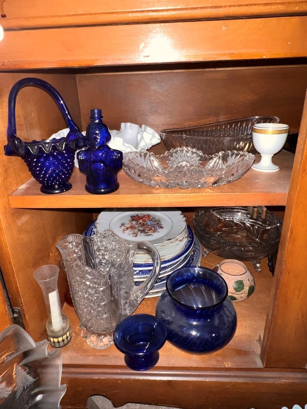 A real treasure trove of pressed cut glass, regular cut glass, Nippon, Opalescent, Cobalt Blue, Depression Glass, etc. Approx. 50 pieces, all from the lifetime collection.