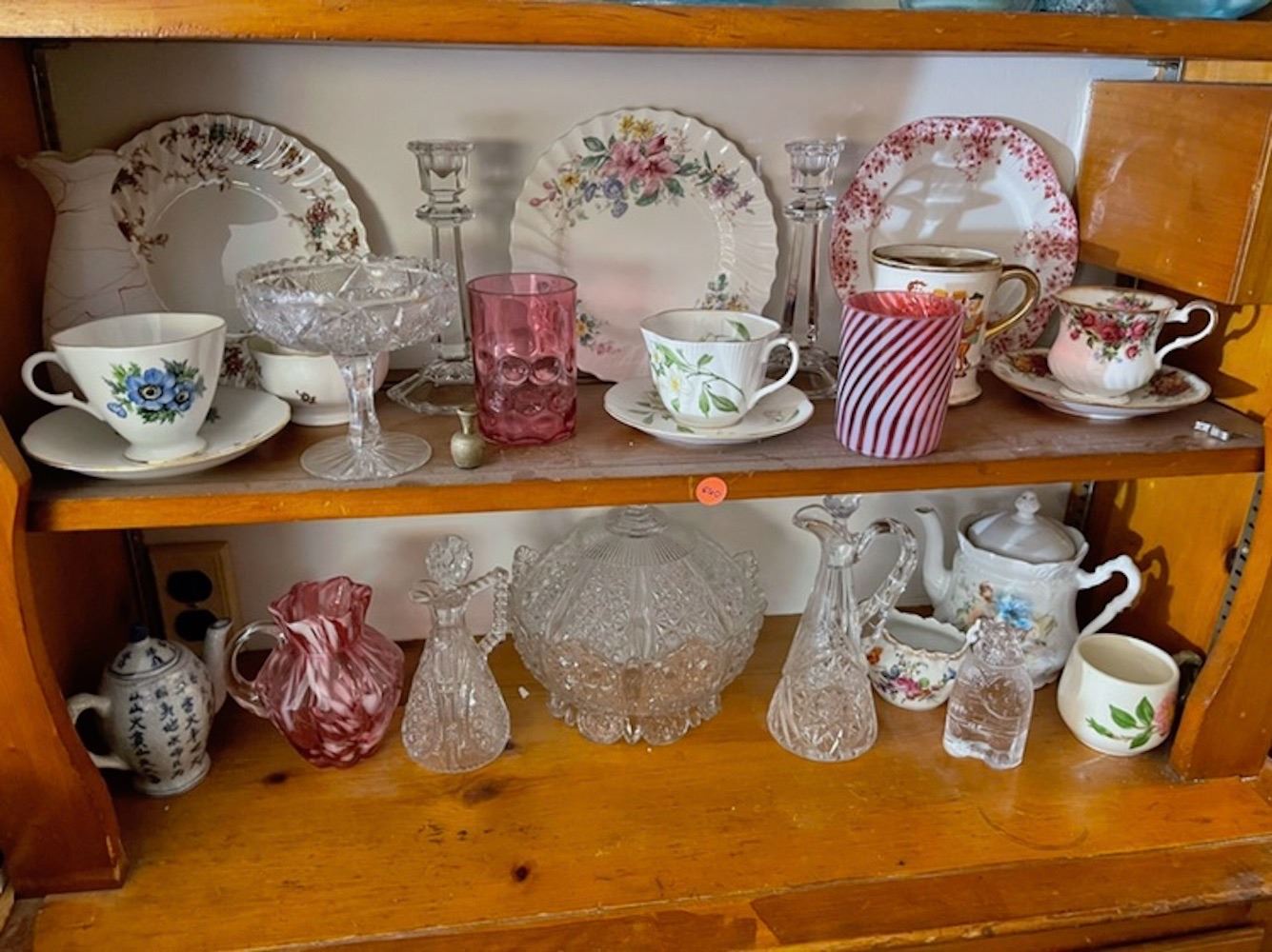 Cut glass collection, cranbury tumblers, 3 floral dishes, 3 teacups with matching saucers, 2 candle stick holders, mustache cup, 2 tea pots, 2 creamers, and 3 vases. Approx. 24 pieces, from the lifetime collection