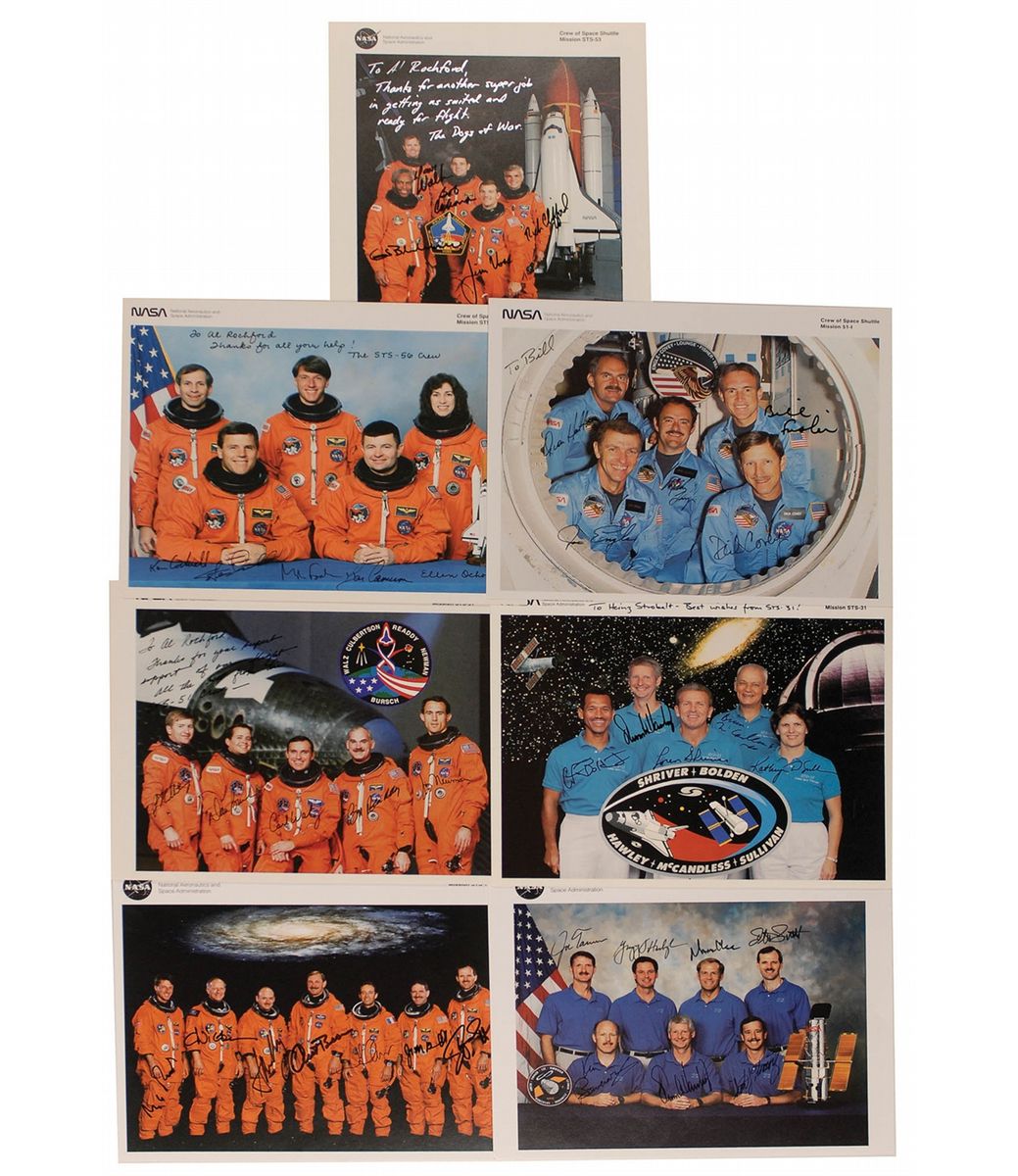 Seven color NASA photos, six 10 x 8 and one 8 x 10, of the various crews of Space Shuttle Discovery, five inscribed, and each signed in black felt tip by the entire crew. Crews are: STS-51-I, STS-31, STS-53, STS-56, STS-51, STS-82, and STS-103. Notable signers in the group are Joe Engle, Bruce McCandless, Charles F. Bolden, Jr., David Walker, Guion Bluford, and Scott Kelly. Three are inscribed to Al Rochford, NASA’s chief suit technician and closeout crew member. In overall fine condition.