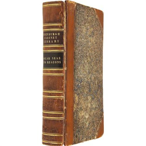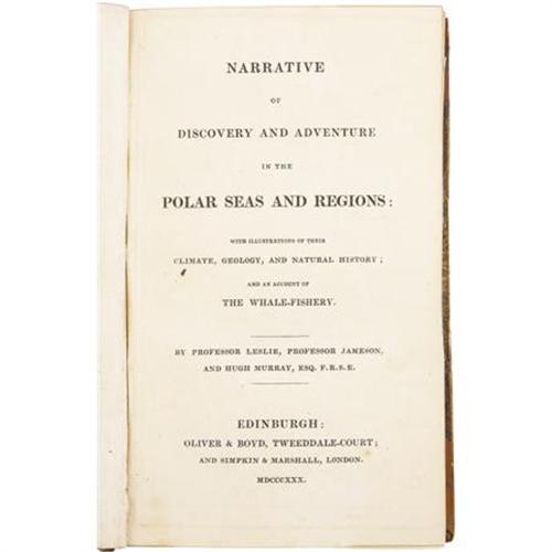 <B>Sir John Leslie, R. Jameson, and H. Murray: </B></I><B><I>Narrative of Discovery and Adventure in the Polar Seas and Regions: with Illustration of Their Climate, Geology, and Natural History; and an Account of the Whale-Fishery </B></I></B></I> (Edinburgh: Oliver & Boyd, 1830), 424 pages, First Edition. 12mo, engraved plates, plus many plates and illustrations in the text, folding map, in contemporary quarter roan, raised bands, gilt titles, marbled boards, some wear at the edges, paper tanned, the plates (not the map or text) are heavily foxed, the front board detached. It is an interesting antique exploration narrative. The book contains information on Arctic weather, salinity of the waters, temperature ranges, and wildlife. The book is also contains a lengthy chapter on whale hunting and information on whale behavior and anatomy. With several detailed sections on early Arctic explorations. <BR><BR><BR><b>Shipping:</b> Books & Catalogs (<a target="_blank" href="http://www.heritageauctions.com/common/shipping.php">view shipping information</a>)