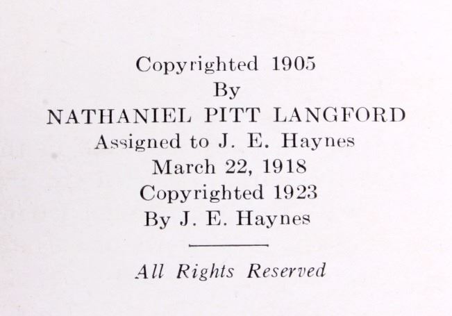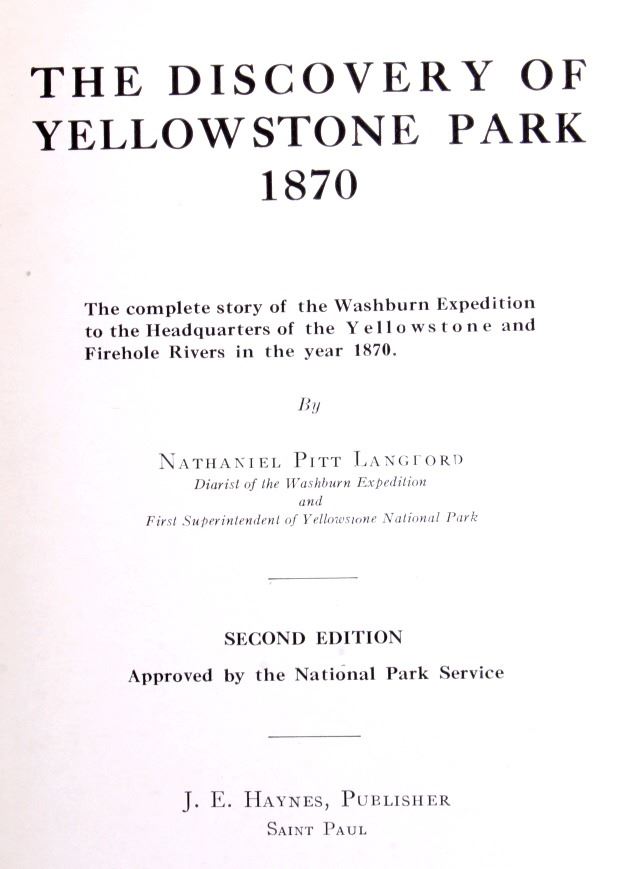 This is a scarce "The Discovery of Yellowstone Park 1870" by Nathaniel Pitt Langford. The book was published by J.E. Haynes in 1923. The book tells the story of the Washburn Expedition in 1870 and features many illustrations, photos, and maps. The book was written by N.P. Langford who was the diarist for the expedition and the first superintendent of Yellowstone. The book is in good condition with the green leatherette covers. The book measures 5" x 7".