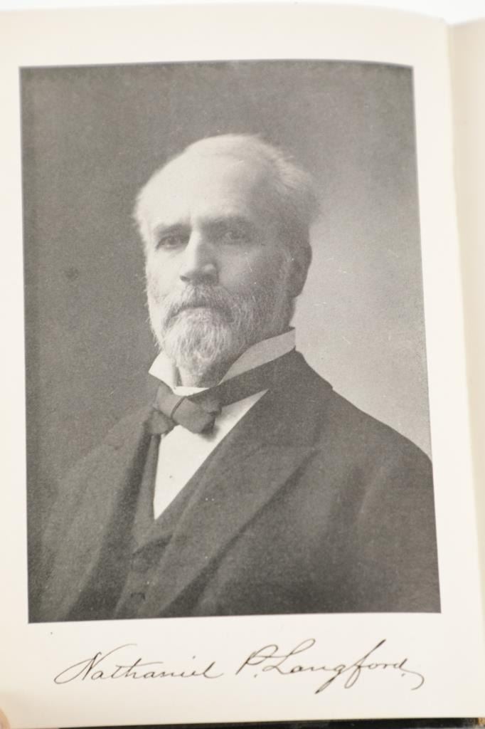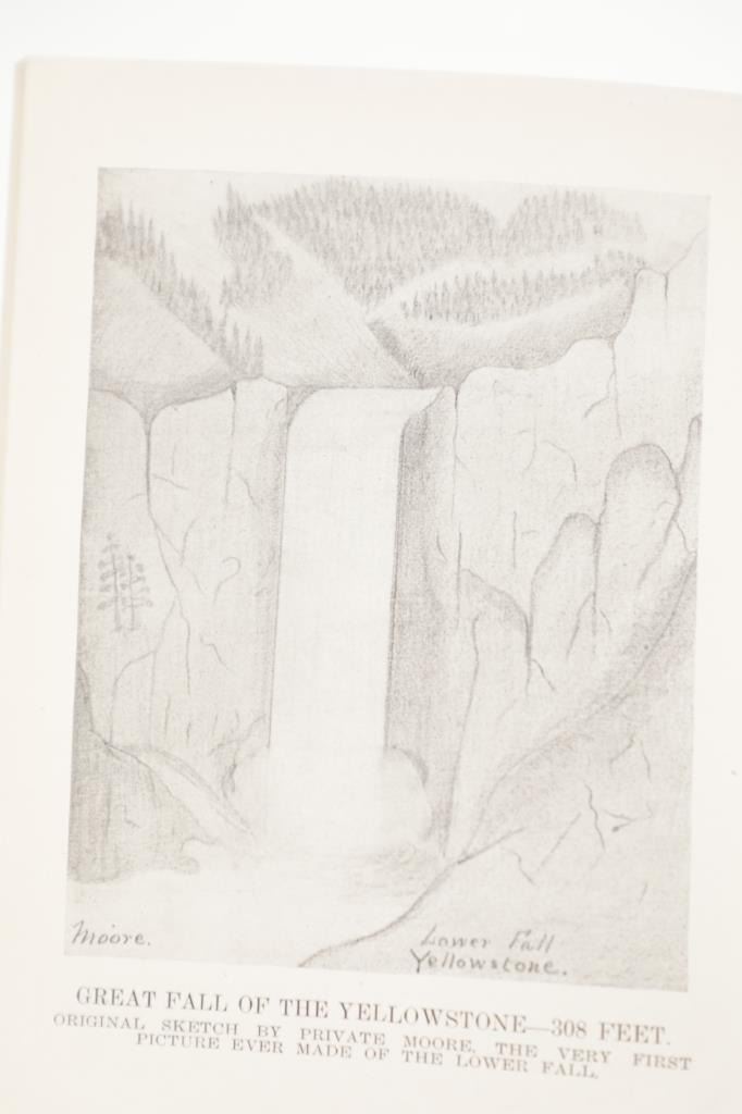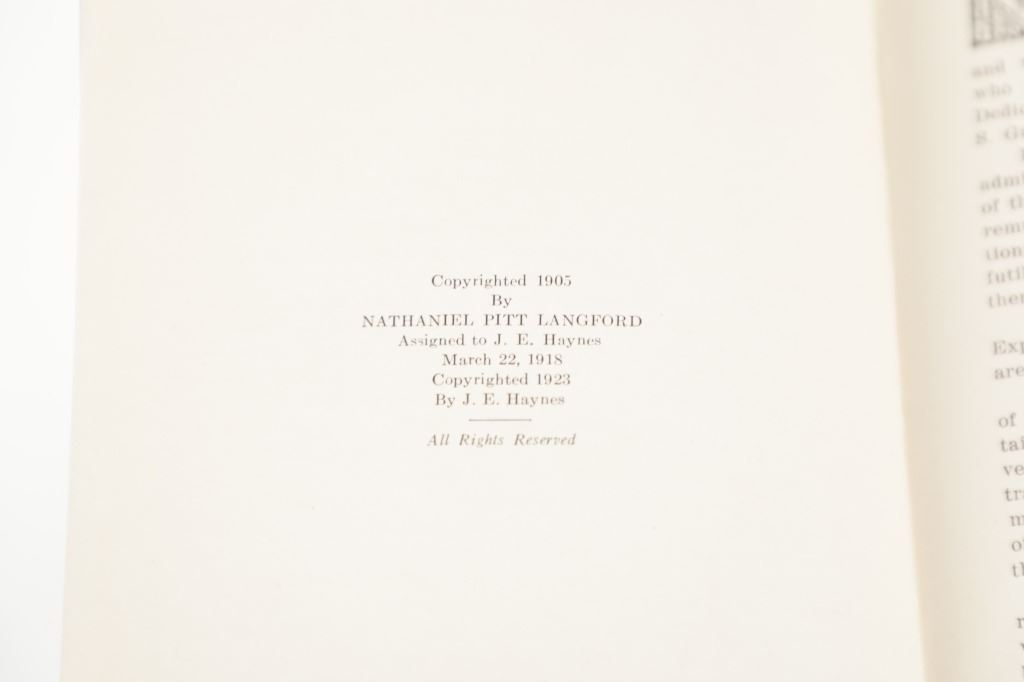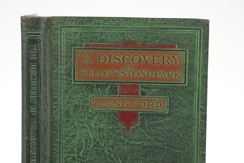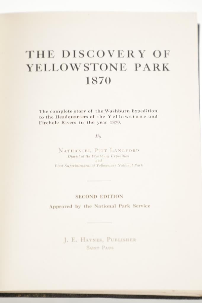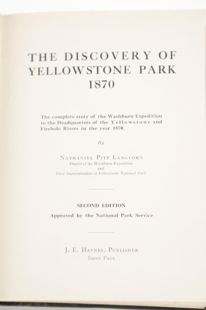 For your consideration is this scarce "The Discovery of Yellowstone Park 1870" by Nathaniel Pitt Langford. The book was published by J.E. Haynes in 1923. The book tells the story of the Washburn Expedition in 1870 and features many illustrations, photos, and maps. The book was written by N.P. Langford who was the diarist for the expedition and the first superintendent of Yellowstone. The condition of this book is good showing good preservation to the green leatherette marbled embossed covers and good overall condition to the pages. The measurements of this book are 5"W x 7"L