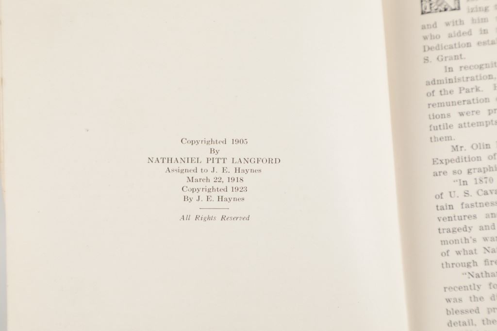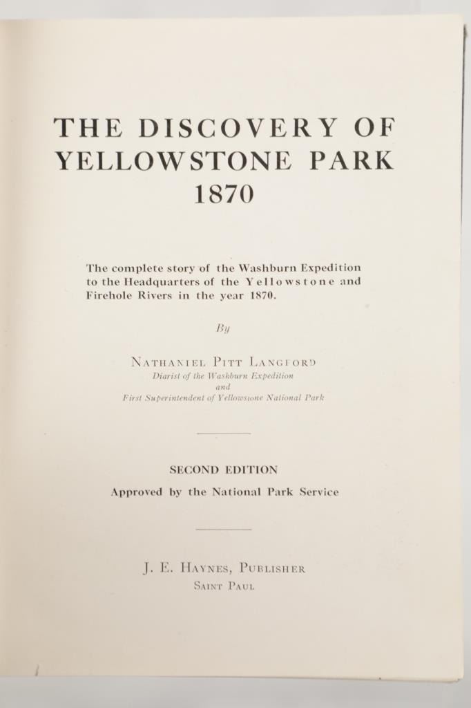 Featured in this lot is a scarce "The Discovery of Yellowstone Park 1870" by Nathaniel Pitt Langford and is a second copy approved by The National Park Service. The book was published by J.E. Haynes in 1923. The book tells the story of the Washburn Expedition in 1870 and features many illustrations, photos, and maps. The book was written by N.P. Langford who was the diarist for the expedition and the first superintendent of Yellowstone. The condition of this book shows it's well preserved with some wear to the spine and outside cover of the book and includes some browning to the pages but otherwise is well preserved. The measurements of this book are 7"L x 5"W. The collective weight of this book is 12oz.*