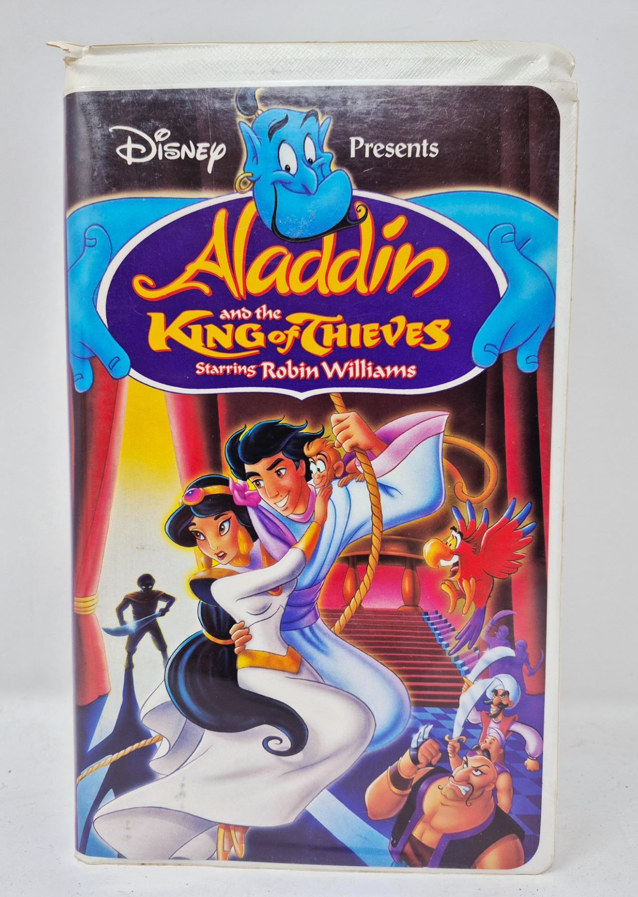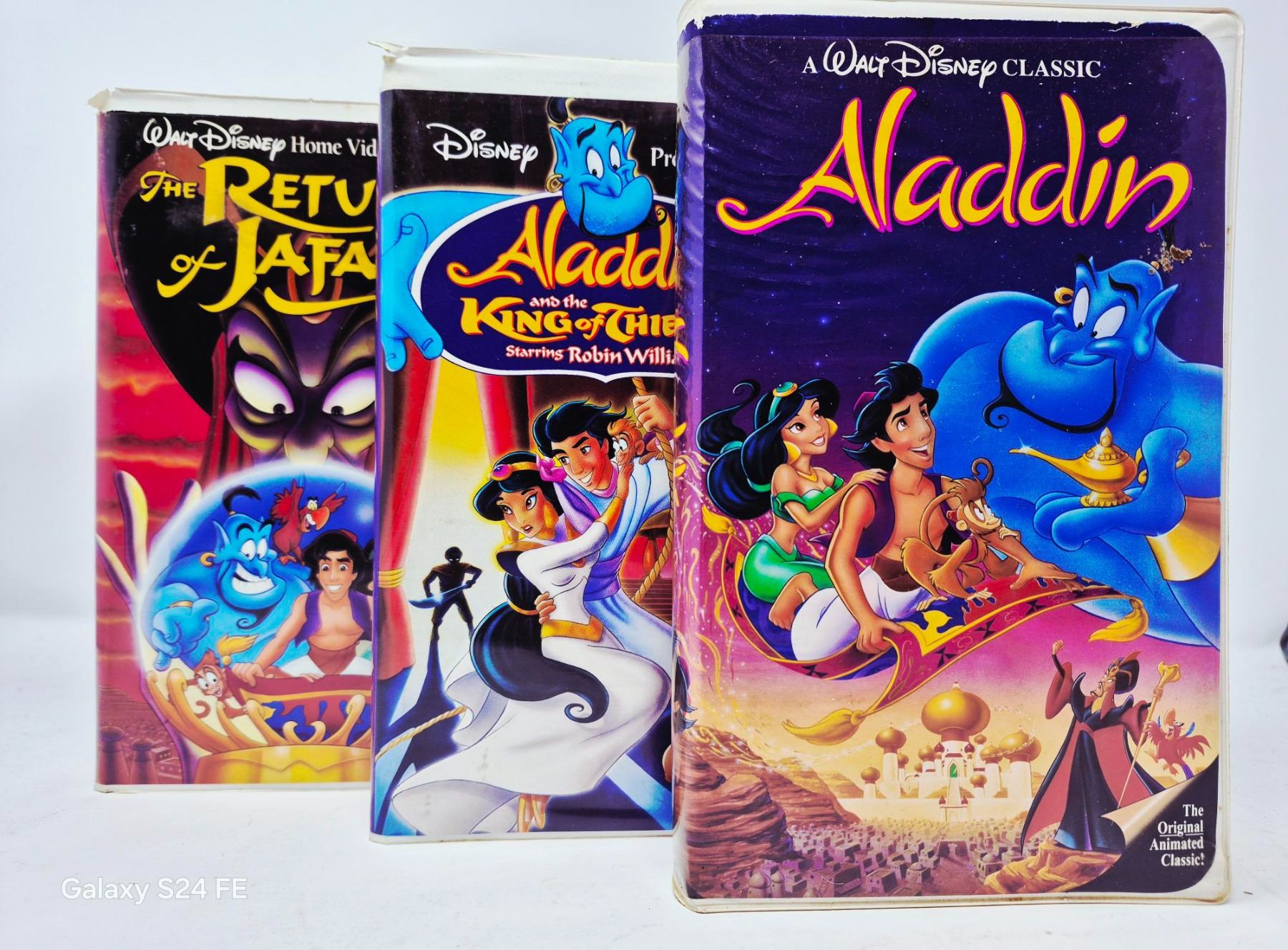 The complete animated Aladdin trilogy on VHS! Includes “Aladdin,” “The Return of Jafar,” and “Aladdin and the King of Thieves” starring Robin Williams.