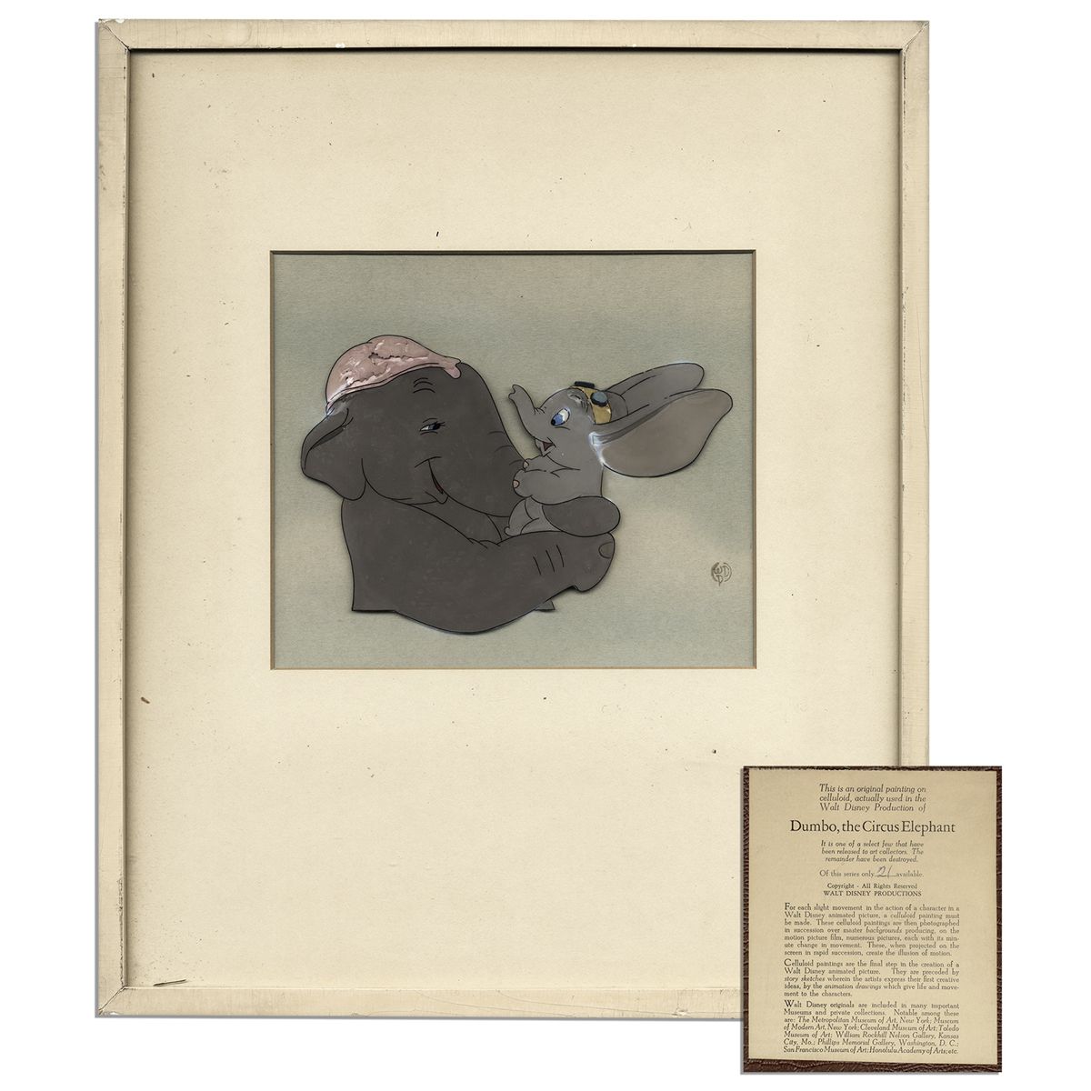 Disney animation cel from the beloved classic ''Dumbo''. Hand-painted cel depicts Mrs. Jumbo embracing her big-eared baby Dumbo. Mrs. Jumbo wears a flat pink hat and Dumbo wears a pair of aviator goggles on a yellow band, pushed up around his forehead for wear in flight. Cel is matted against a plain, pale blue background that bears a stamp, ''WDP'' to the lower right. With Albert Roullier Art Gallery, Chicago label affixed to verso above another label, printed, ''This is an original painting on celluloid, actually used in the Walt Disney production of 'Dumbo, the Circus Elephant'''. It is one of a select few that have been released to art collectors. The remainder have been destroyed. Of this series only [handwritten] 21 available...'' Label goes on to explain the process of animation, which involves producing individual cels for every character movement or change of expression. Cel measures 6'' x 4'', matted and framed to an overall size of 11'' x 13''. Light buckling, chipping to paint on the pink hat and some minor cracking to Dumbo's goggles, else near fine.