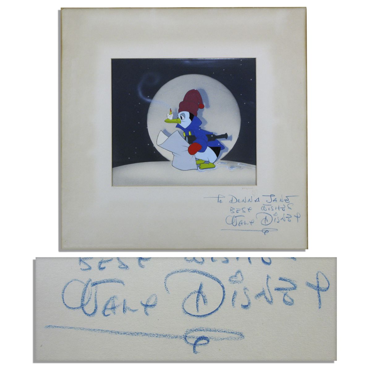 Original animation cel from Walt Disney's classic 1945 feature, ''The Three Caballeros''. This particular cel is from the ''Cold-Blooded Penguin'' 7-minute segment of the film, in which Pablo the Penguin who decides to leave the South Pole and head north towards South America to a warmer climate. Depicts Pablo the Penguin looking at a map. Cel is signed along lower right of mat in blue crayon, ''To Donna Jane / Best Wishes / Walt Disney''. And in another hand along the mat, though very faint, ''From Three Caballeros'' / ''original'' and, within a small circle, ''WD / P'' (Walt Disney Productions). . Matted and set up by Courvoisier, the official art gallery for Walt Disney Studios during much of the 20th century. Matted and framed to an overall size of 14.5'' x 14'', with viewable area of 8.5'' x 7.5''. Near fine condition.