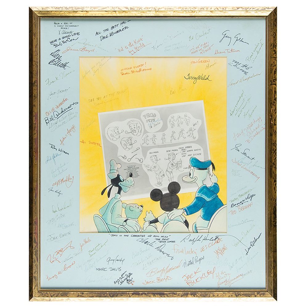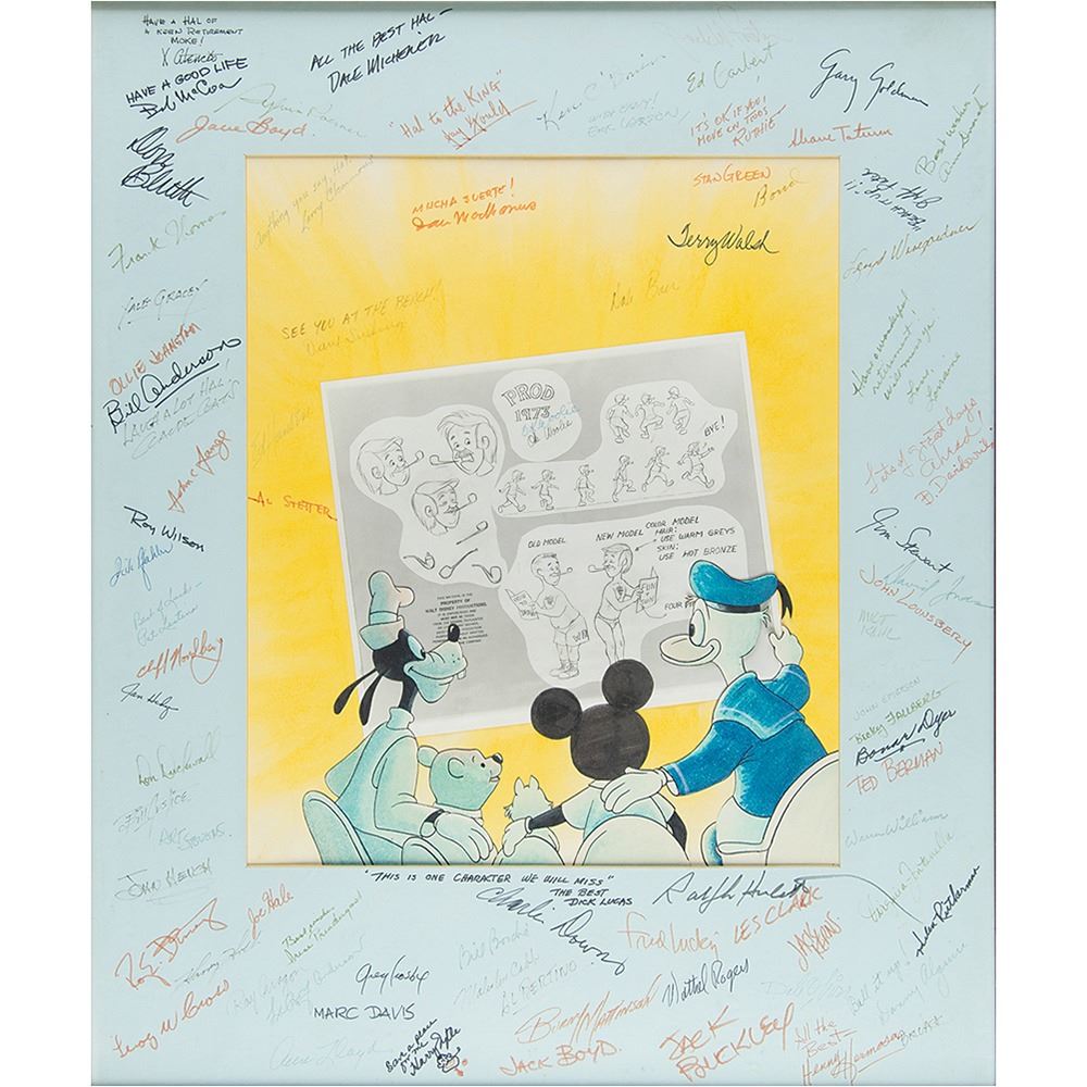 Oversized retirement card featuring an image of classic Disney characters looking at a model sheet, 19.5 x 23.5, signed and inscribed by a multitude of Disney animators and icons, including Marc Davis, Ollie Johnston, John Lounsbery, Milt Kahl, Eric Larson, Woolie Reitherman, Les Clark, Bill Anderson, Don Bluth, Bill Justice, and Roy E. Disney. Framed to an overall size of 21.5 x 25.5. In fine condition. A unique format boasting the autographs of most of Disney's legendary 'Nine Old Men.'