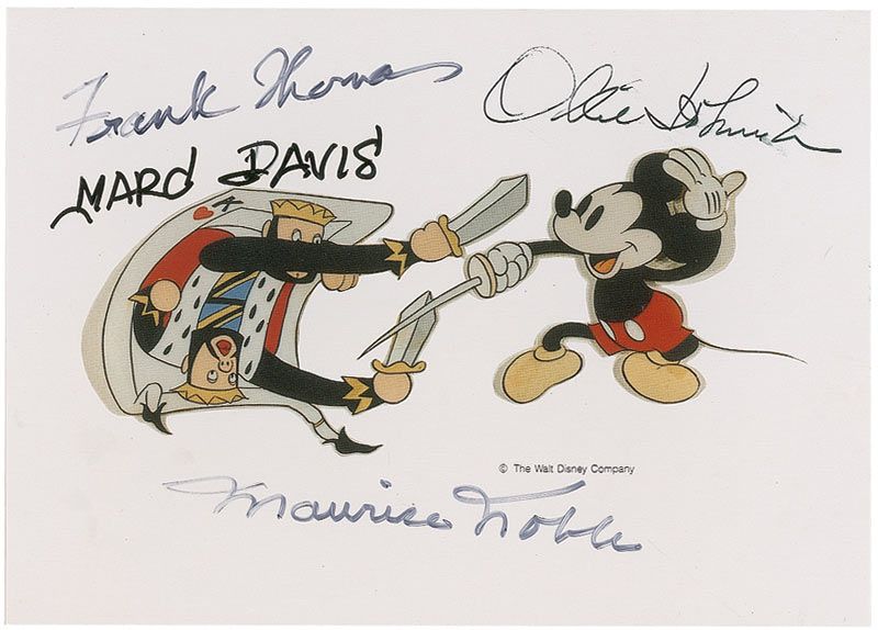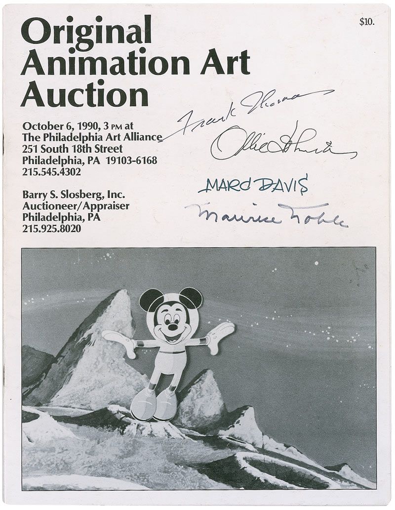 Two items: an Animation Art auction catalog, 8.5 x 11, from a 1990 auction by the Philadelphia Art Alliance, signed on the front cover in black felt tip by Frank Thomas, Ollie Johnston, Mark Davis, and Maurice Noble; and an invitation to A Salute to Disney Animation Art, 7 x 5, signed on the front cover in black felt tip by Frank Thomas, Ollie Johnston, Mark Davis, and Maurice Noble. Notations and bidder number filled in on catalog, and a couple trivial brushes to a couple signatures on card, otherwise fine condition.