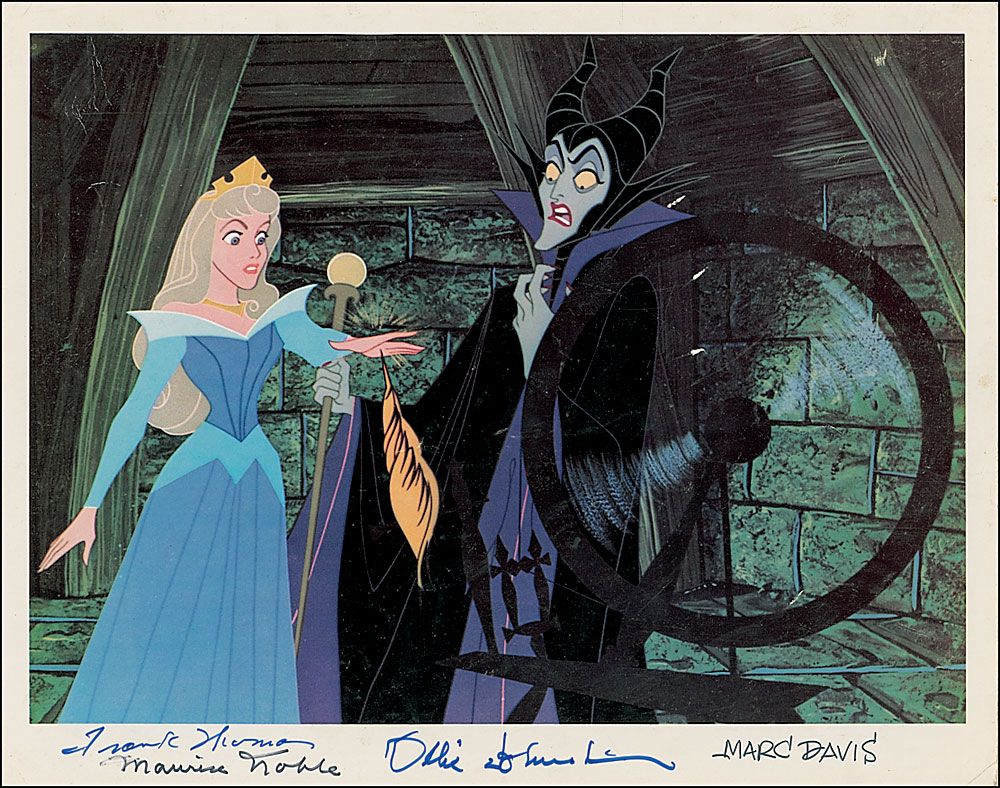 Color 14 x 11 print from Sleeping Beauty, signed in the lower border in felt tip by four great animators, including three of Walt Disney’s “Nine Old Men”: Marc Davis, Ollie Johnston, Frank Thomas, and Maurice Noble. In very good condition, with some noticeable creasing and surface marks.