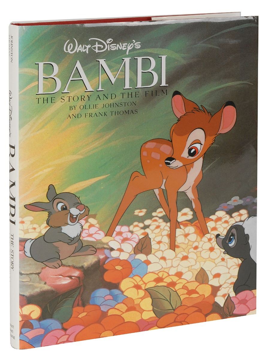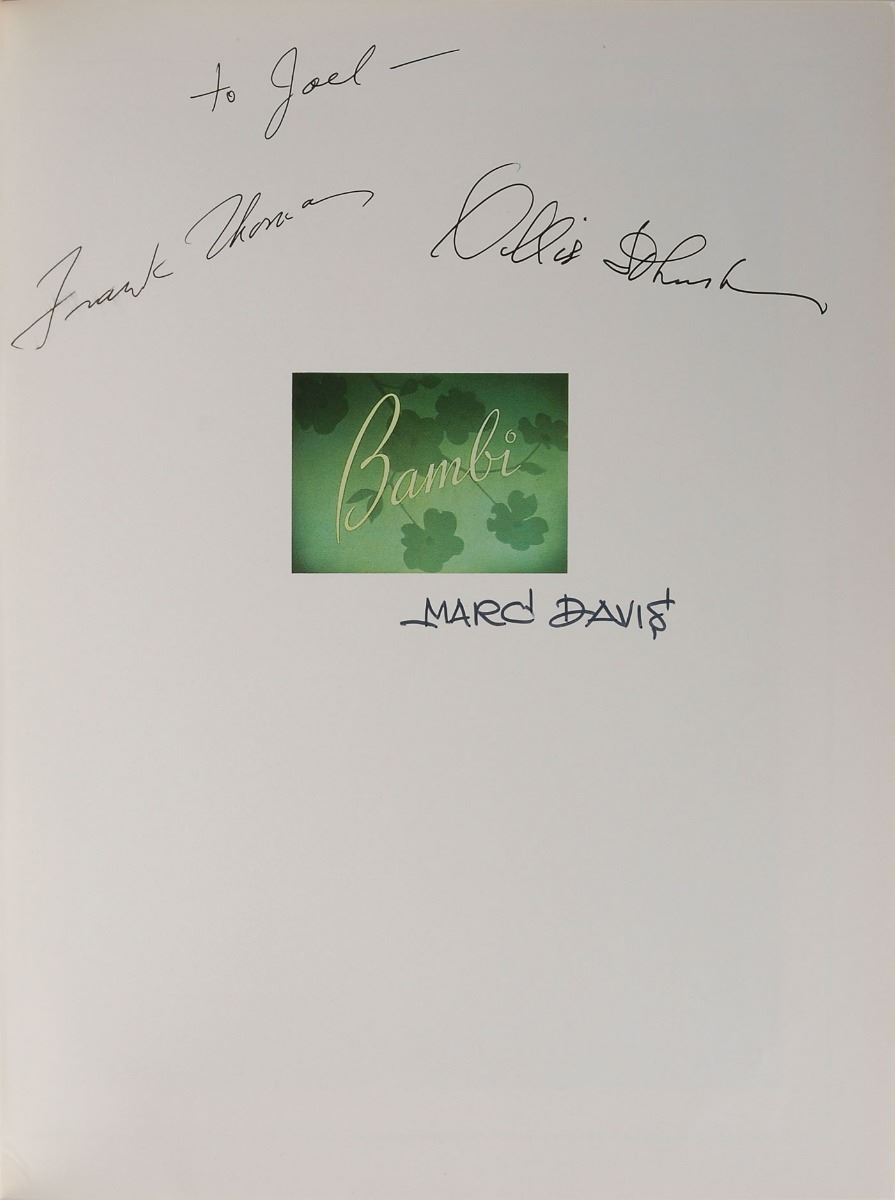 Signed book: Walt Disney’s Bambi: The Story and the Film. First edition. NY: Stewart, Tabori & Chang, Inc., 1990. Hardcover with dust jacket, 9 x 11.5, 208 pages. Signed and inscribed on the half-title page in black ink, “To Joel—Frank Thomas” and “Ollie Johnston,” and in black felt tip, “Marc Davis.” In fine condition.