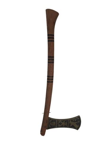 Disney Archives Medieval axe made of a lightweight wood handle painted brown stripes, metal axe head with design painted on the axe head. (30"x8").