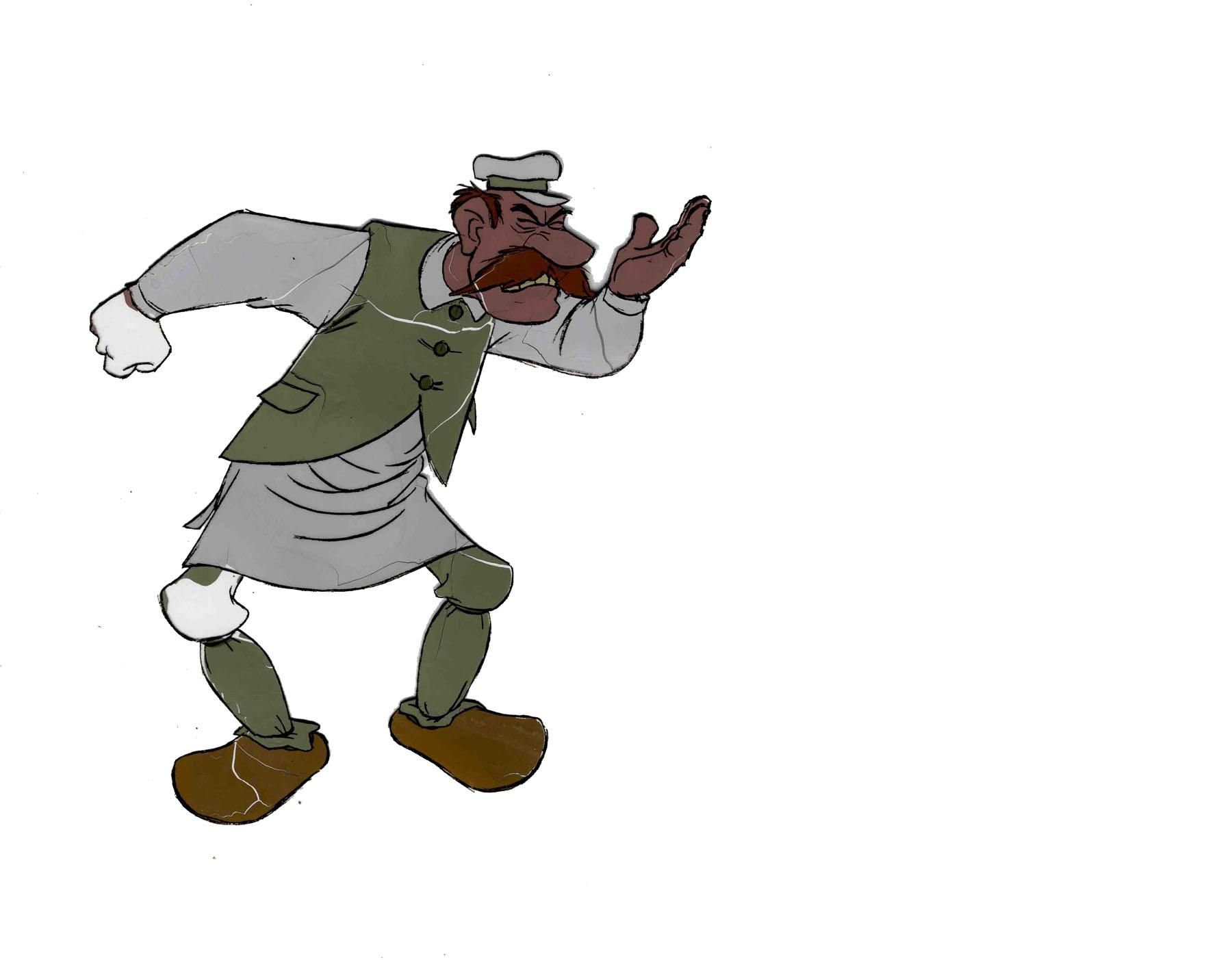 Original Disney animation celluloid from the 1970 film, ''The Aristocats.'' Particularly rare, as ''Aristocats'' was the last film Walt Disney approved before his death in 1966, before the film's release. Cel depicts a French milkman. Cel measures 16'' x 12.5'' and is very delicate from age, with chipping on milkman's knee and hand. Very good condition overall.
