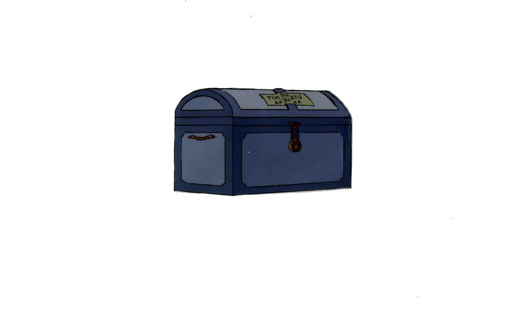 Original Disney animation celluloid from the 1970 film, ''The Aristocats.'' Particularly rare, as ''Aristocats'' was the last film Walt Disney approved before his death in 1966, before the film's release. Cel depicts a locked trunk, postmarked for Timbuktu, Africa. Has particular importance in film's plot, as the main antagonist, Edgar, hopes to get rid of the ''Aristocats'' by shipping them to Africa in featured trunk. Cel measures 16'' x 12.5'' and is very delicate from age, with subtle fading on trunk's edge. Very good condition.