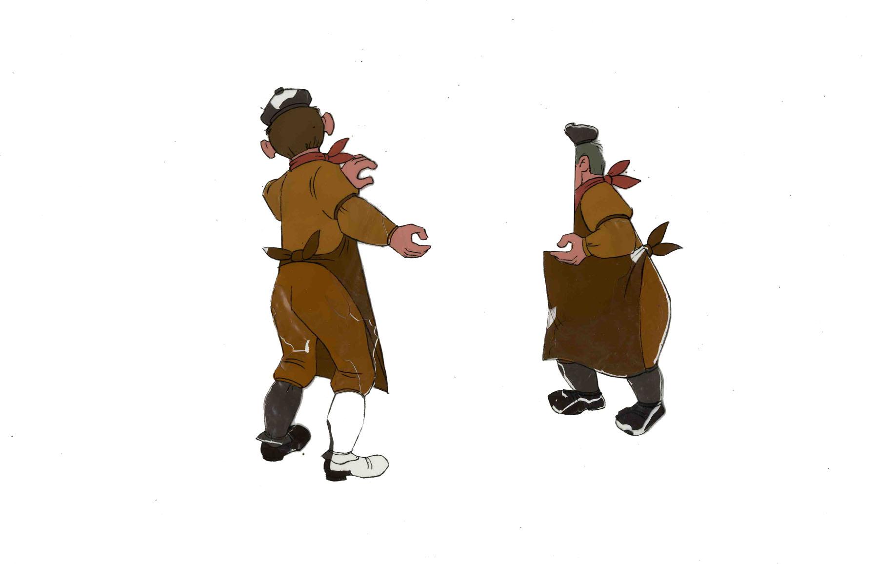Original Disney animation celluloid from the 1970 film, ''The Aristocats.'' Particularly rare, as ''Aristocats'' was the last film Walt Disney approved before his death in 1966, before the film's release. Cel depicts two french movers in uniform. Cel measures 16'' x 12.5'' and is very delicate from age, with cracking and color loss throughout. Good condition overall.