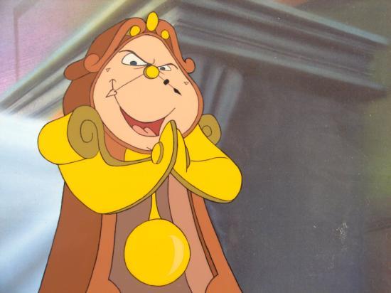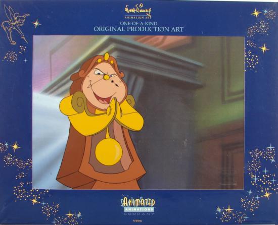 This is a special Disney Animation Production Art Cel with accompanying Drawing from the feature film Beauty and the Beast: Belle's Magical World. Showcasing a scene from the movie, this charming work of art depicts the pendulum clock, Cogsworth, with a devious expression on his face.