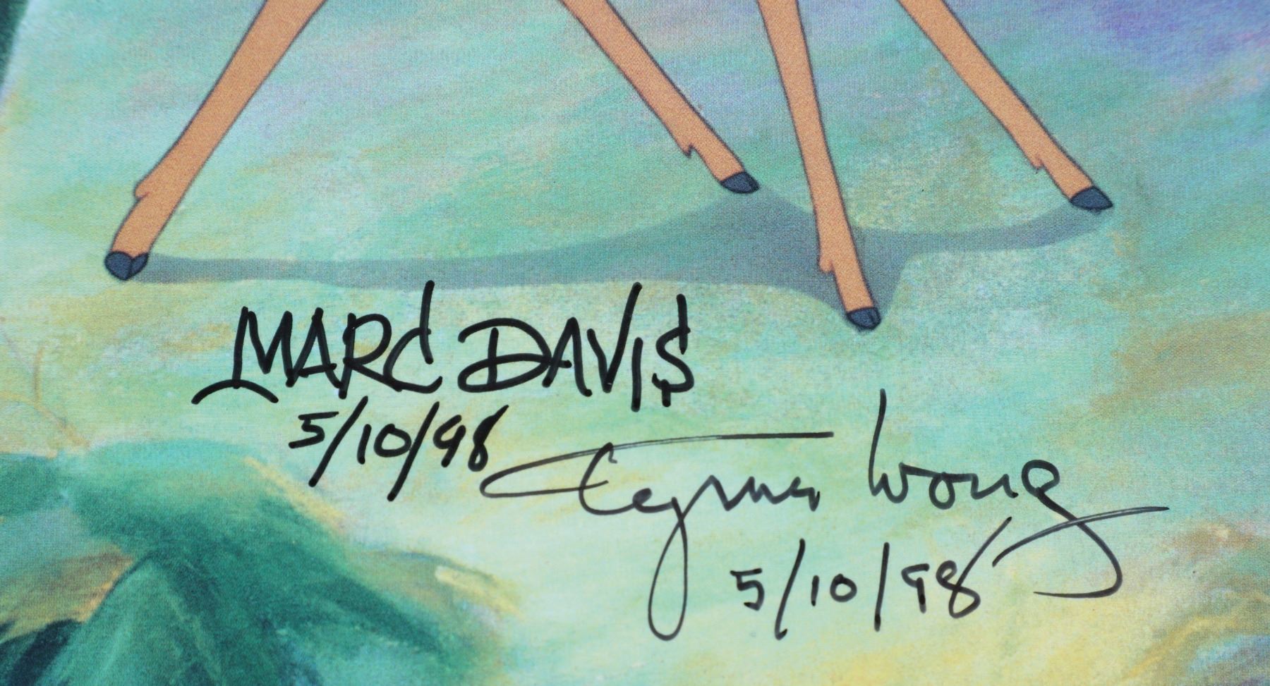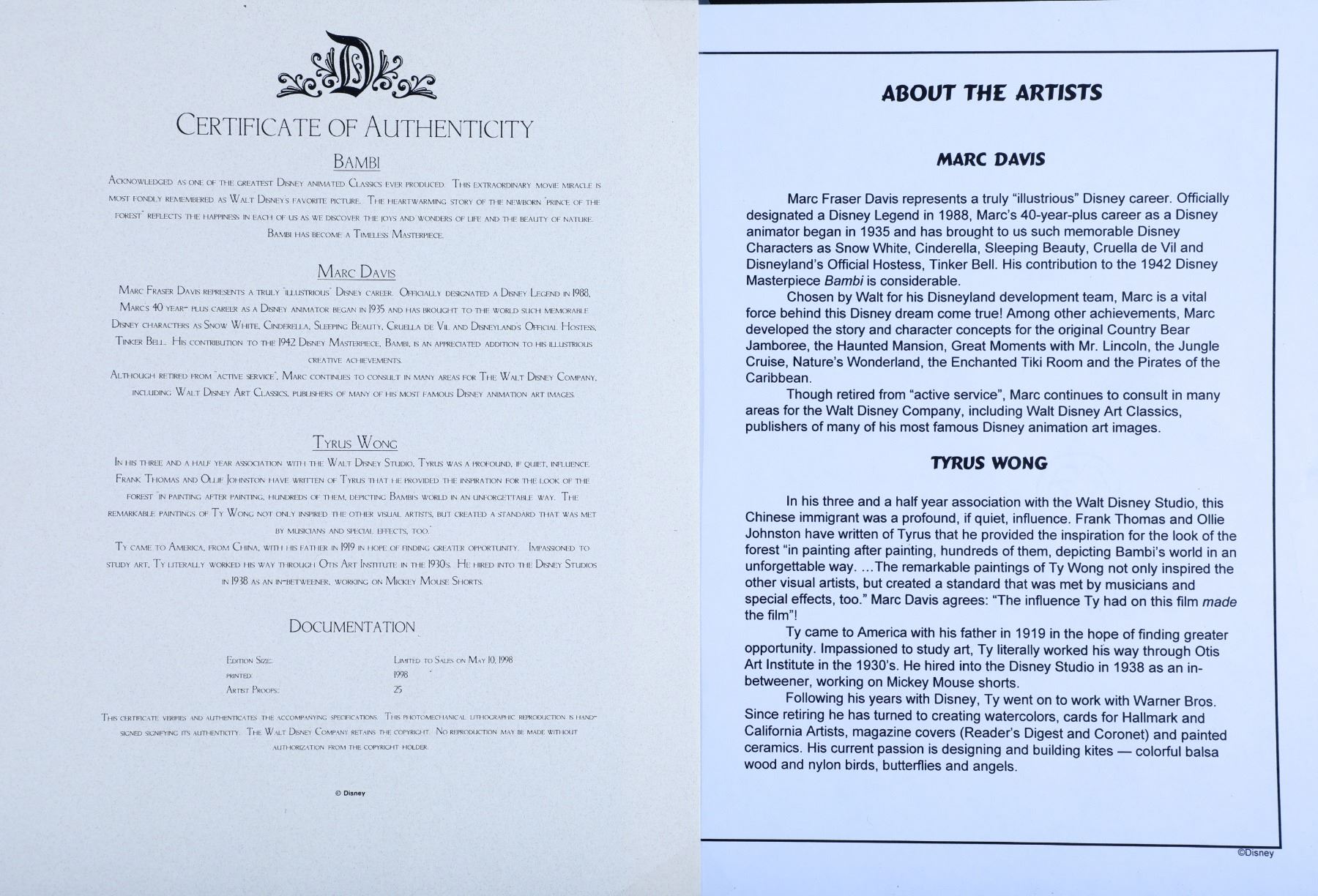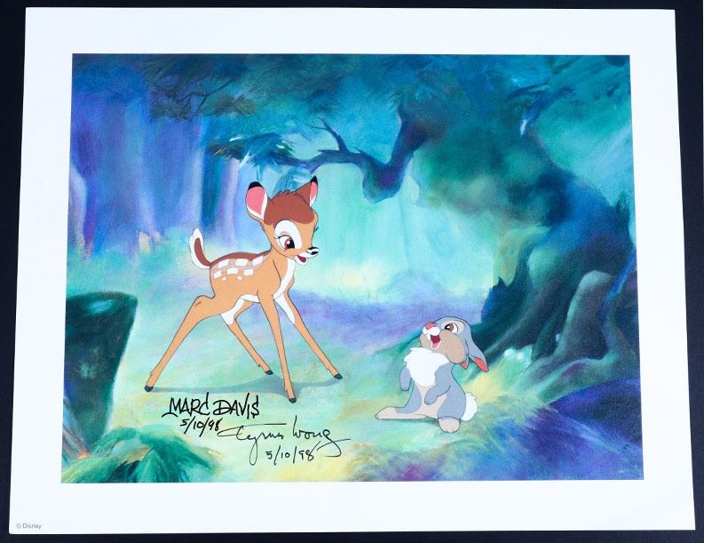 (Disneyland, Disney Gallery, c. 1998). A very rare Disney Bambi Artist Proof (1 of 25) lithograph signed by animators Marc Davis and Tyrus Wong on May 10, 1995. The lithograph features Bambi and Thumper and comes with an official Disney Certificate of Authenticity. The lithograph is in good condition with normal wear from age and minimal handling. Item comes with a Grand Circle Tour Auctions COA.