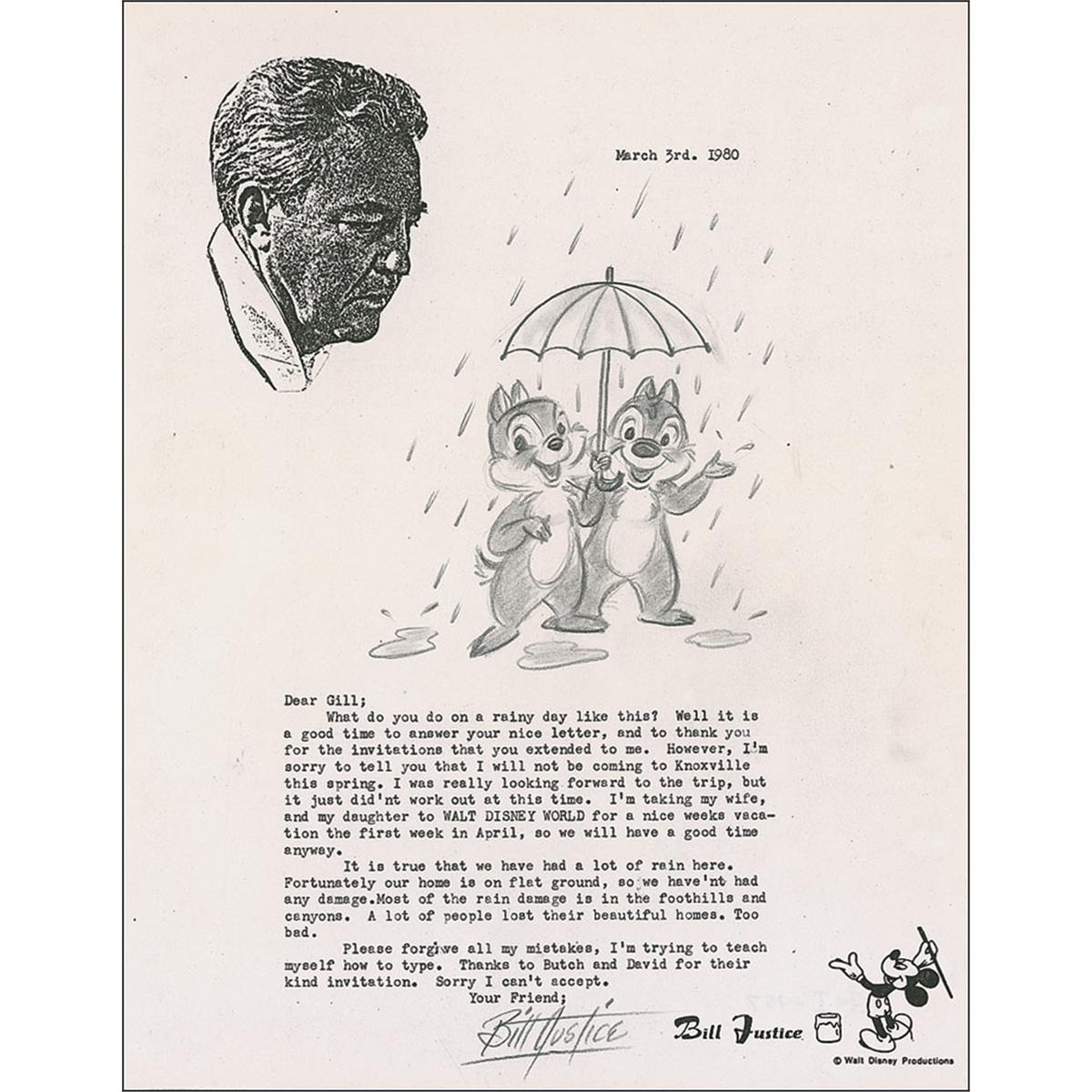 TLS, signed in pencil, one page, 8.5 x 11, personal letterhead, March 3, 1980. Letter to Gill Nelson. In part: “What do you do on a rainy day like this? Well it is a good time to answer your nice letter, and to thank you for the invitation you extended to me…I’m taking my wife and my daughter to Walt Disney World for a nice week’s vacation.” At the top of the letter, Justice adds a great pencil sketch of Chip n’ Dale sharing an umbrella during a rain storm In fine condition. Accompanied by the original mailing envelope as well as a candid snapshot of Justice at an event.