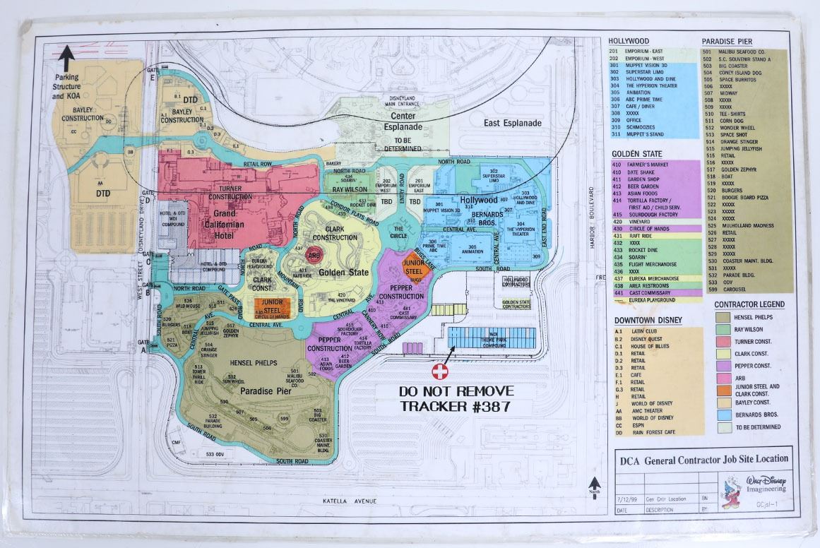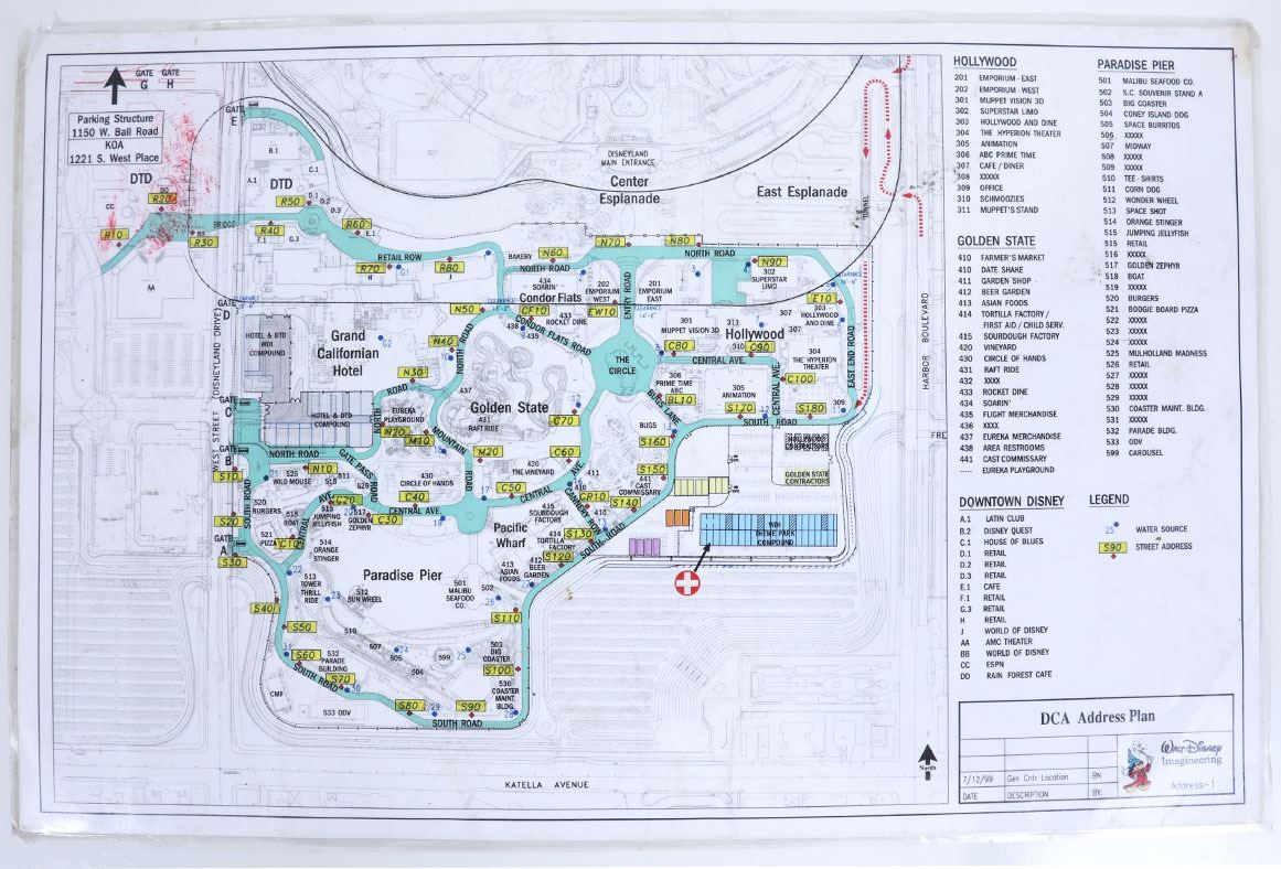 (Disney California Adventure, c. 1999). A very rare Disney California Adventure address plan showing the layout for the new park. The address plan created by Walt Disney Imagineering is in good condition with normal wear from age and park use. Item comes with a Grand Circle Tour Auctions COA.