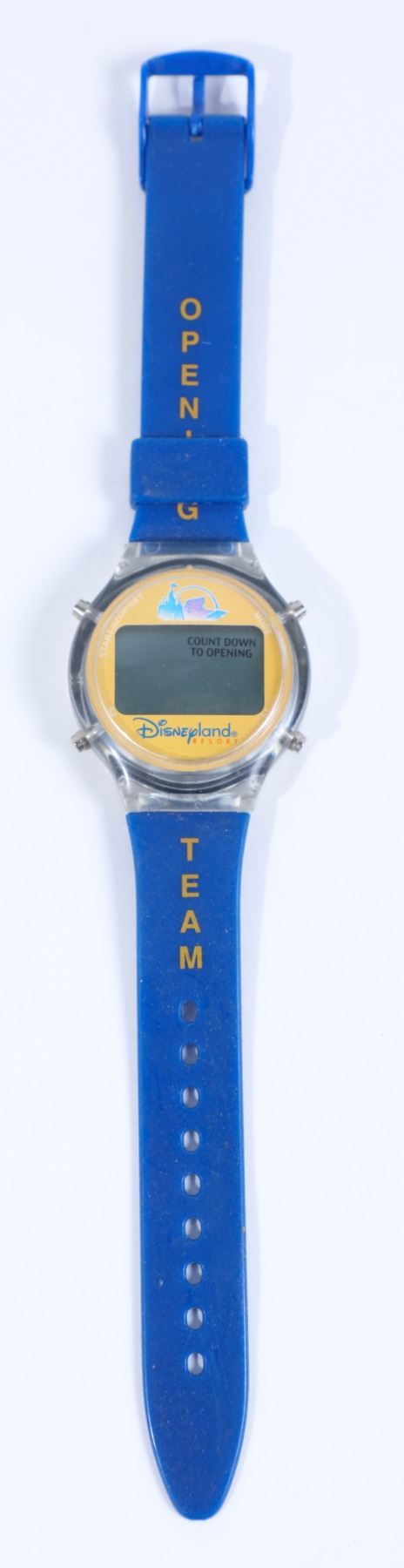 (Disney California Adventure, c. 2001). A rare exclusive Disneyland California Adventure opening team watch. The watch features the classic logo for Disneyland California Adventure park along with the Disneyland Resort logo with a gold background. The band is set in a deep blue with the gold lettering "opening team." The watch is in good working condition with normal wear from age and minimal handling. Item comes with a Grand Circle Tour Auctions COA.