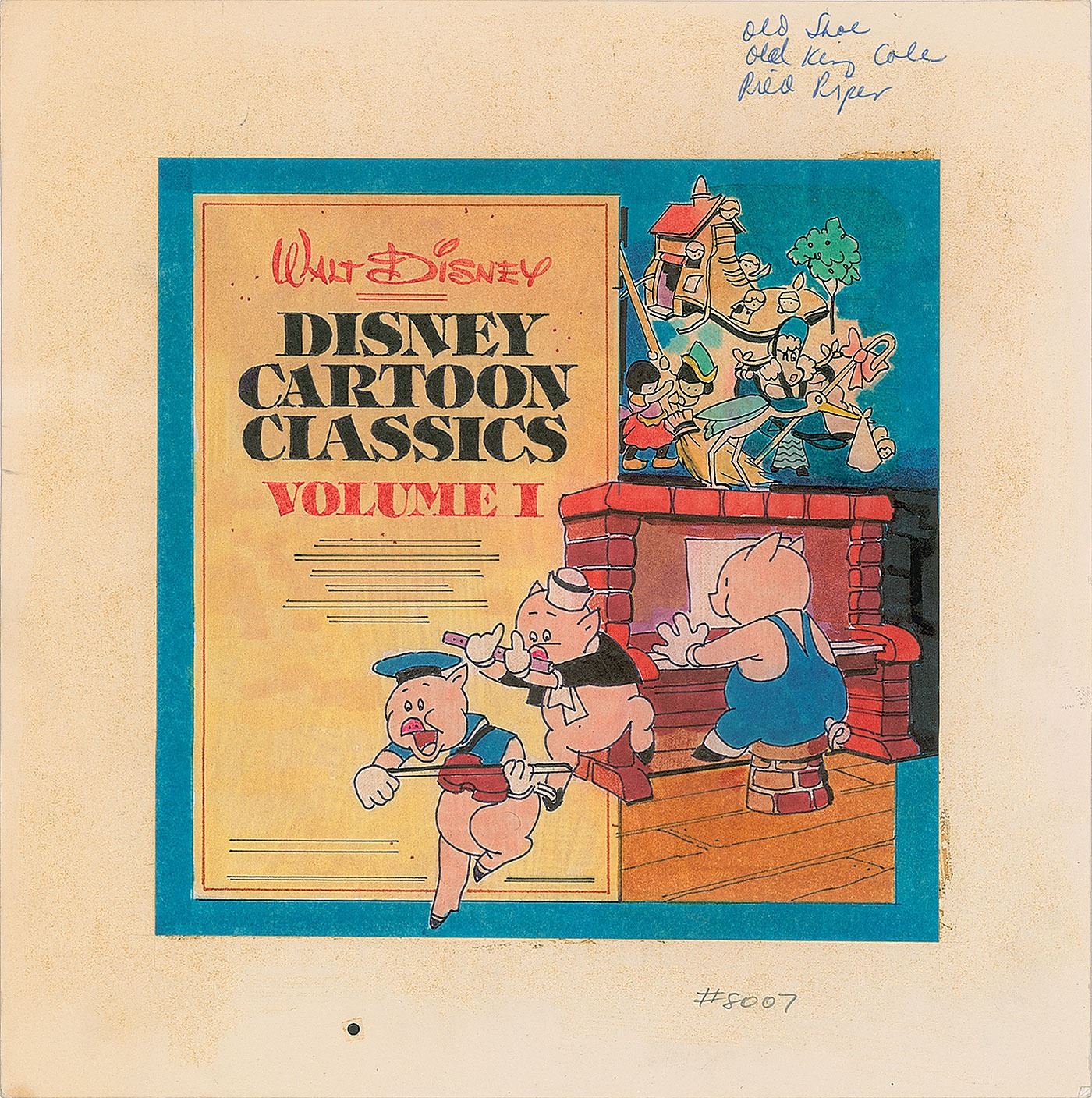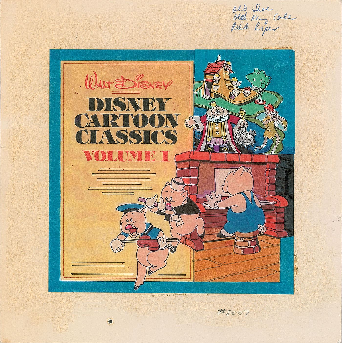 (Walt Disney Studios) Original color concept artwork for the box cover of the Super 8 home movie "Disney Cartoon Classics, Volume 1," accomplished on a 7.25 x 7.25 sheet. The cover shows the Three Little Pigs playing music; the upper right corner shows fairy tale–inspired artwork, and has a detached pasteover piece that shows Old King Cole and the Pied Piper. The artwork has been applied to a larger 10 x 10 cardstock sheet. In fine condition.