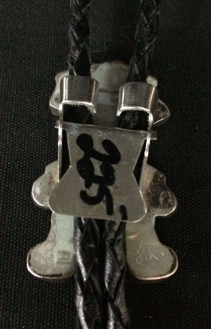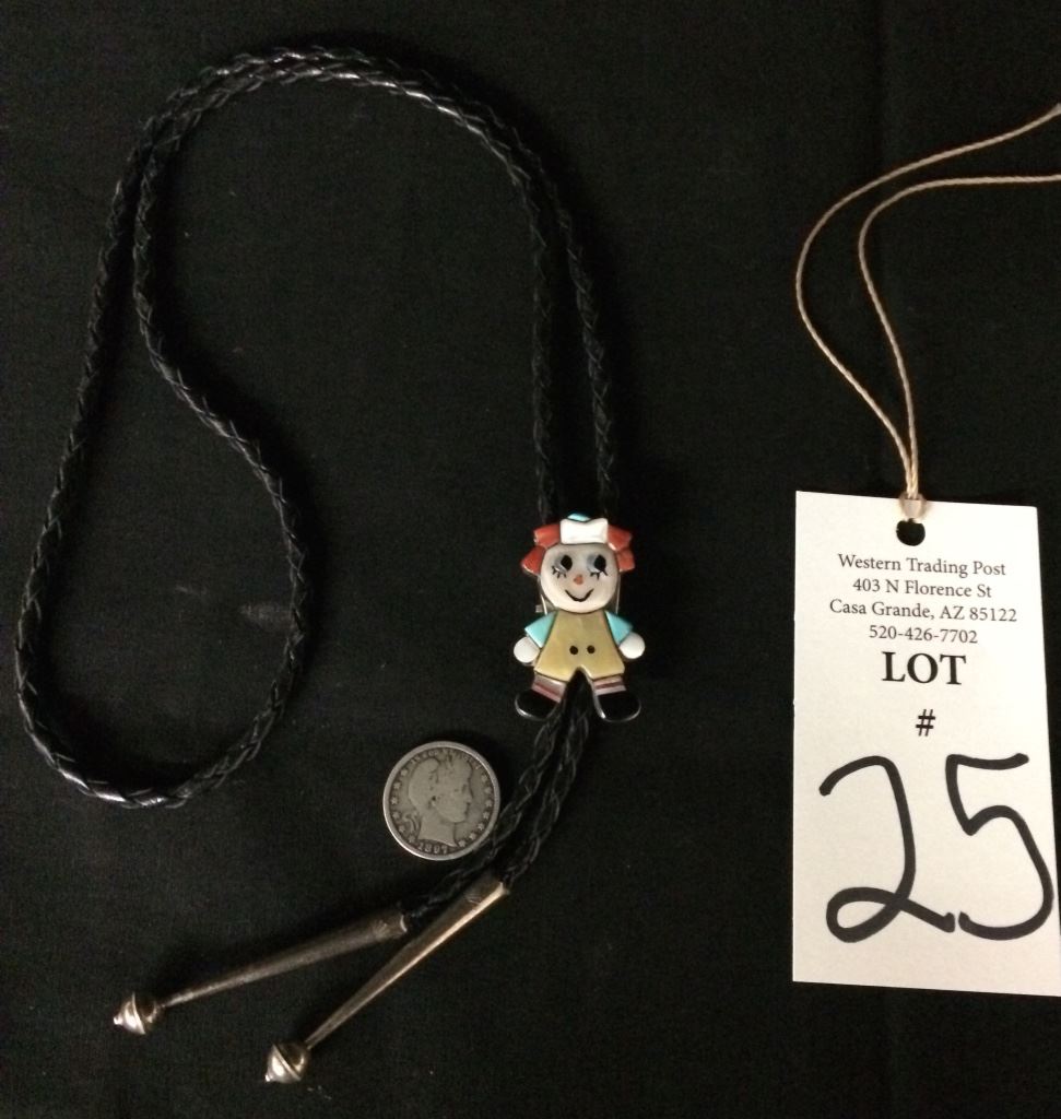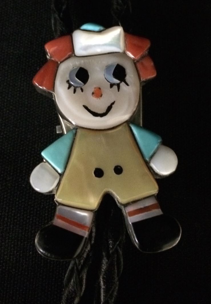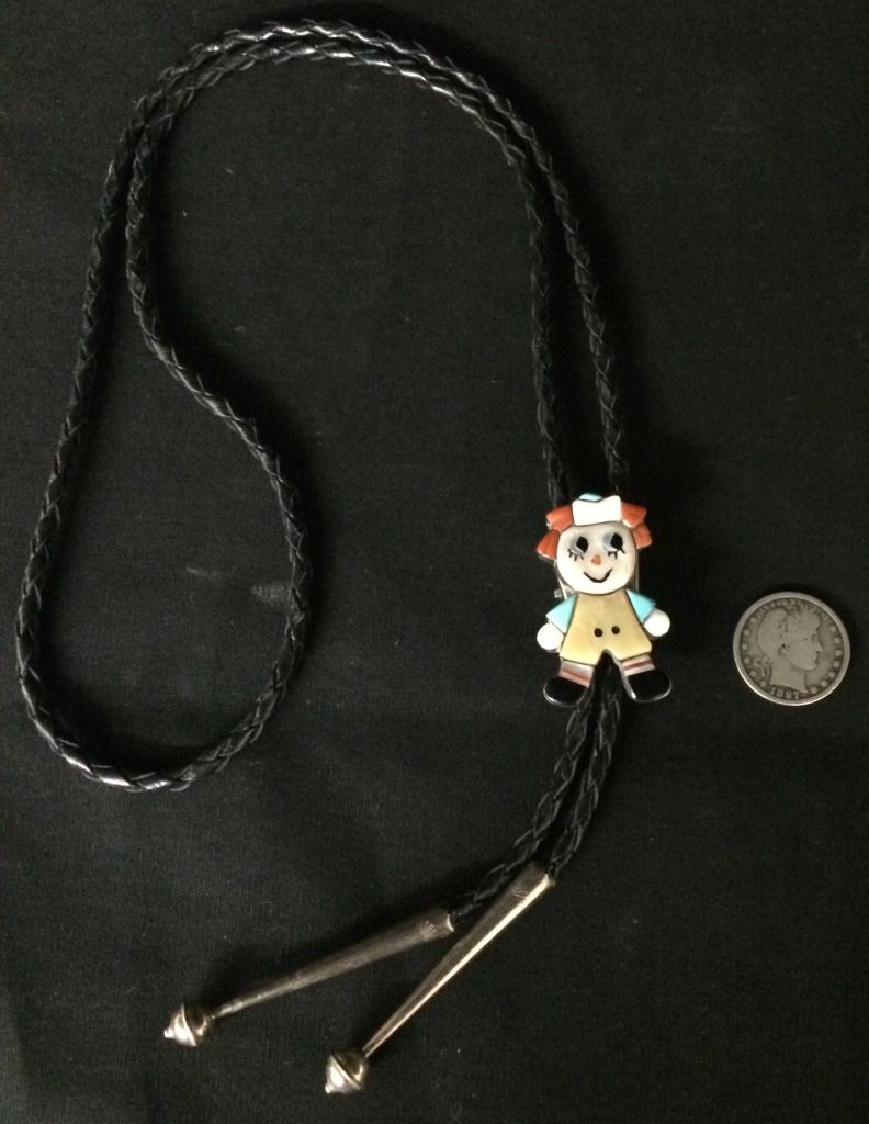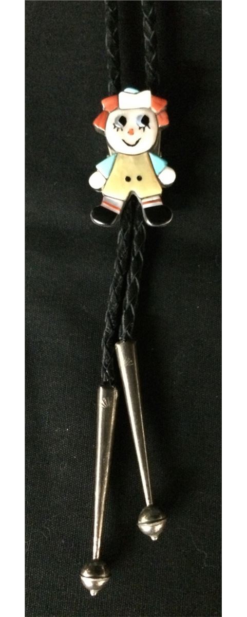 Rare! This Zuni Bolo looks like a Disney Character (Raggedy Ann). Signed on the back with an etched P.L. (circa 1960s - 70s). Set in sterling with sterling tips and weighs approx. 20.4g. with most of the bolo cord off the scale. Good condition. Shipping: There will be a $5 handling / packaging fee for shipping this lot. The actual cost of postage will be added on top of that.