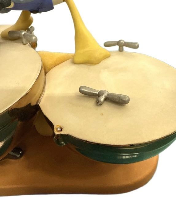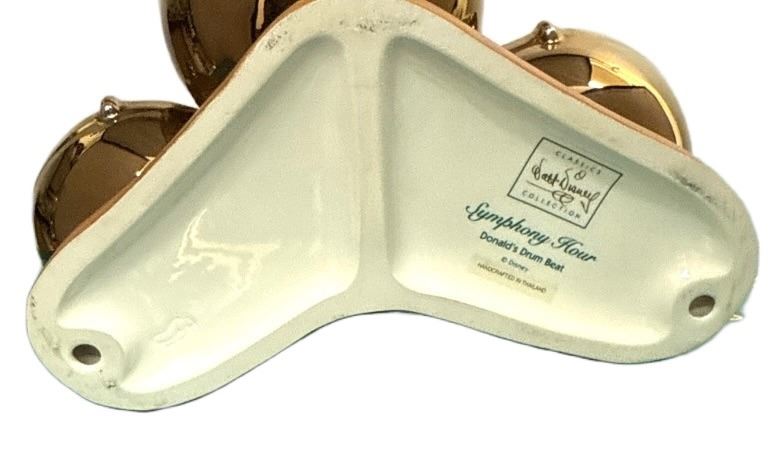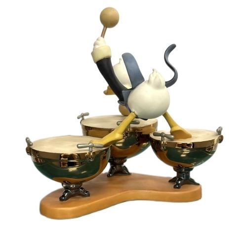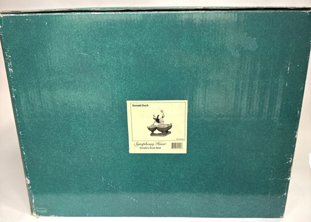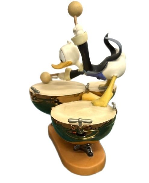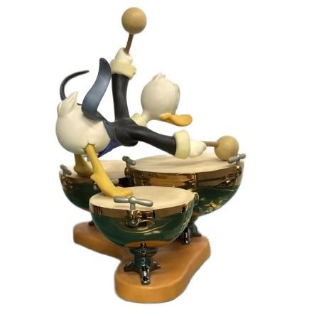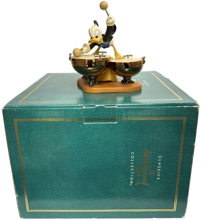 Item/Description: Walt Disney Classics Collection (WDCC) "Donald's Drum Beat" figurine, inspired by the 1942 animated short film Symphony Hour. The piece depicts Donald Duck enthusiastically playing a set of timpani drums. It is made of porcelain, with the drums featuring copper and steel metallic paint and the drum tuners made of pewter. It was released in 1996 and retired in 1997. Includes original box.