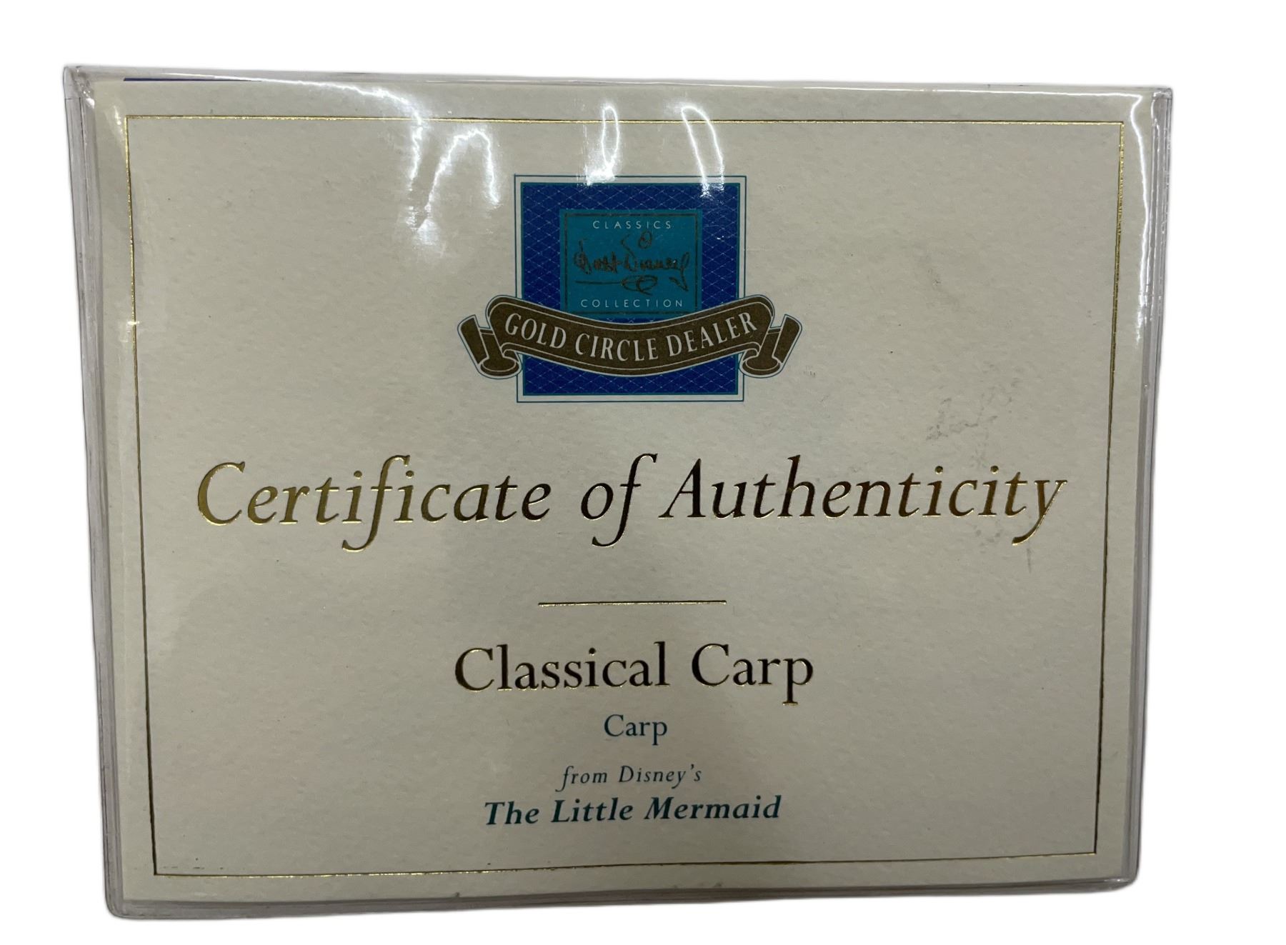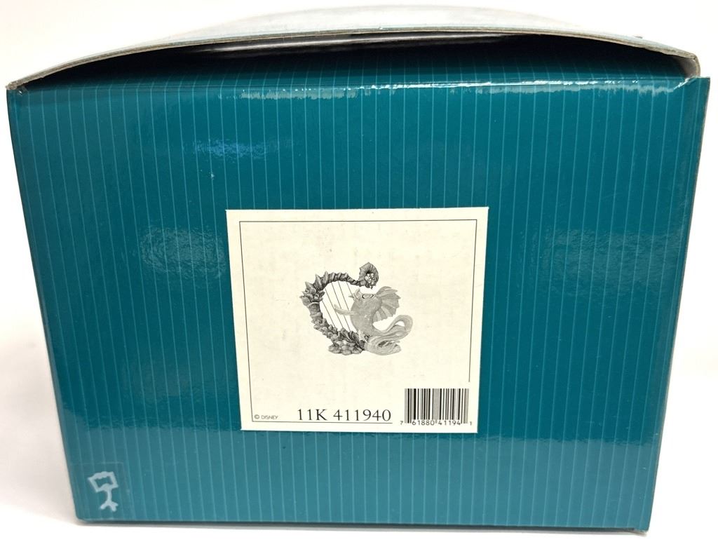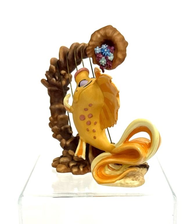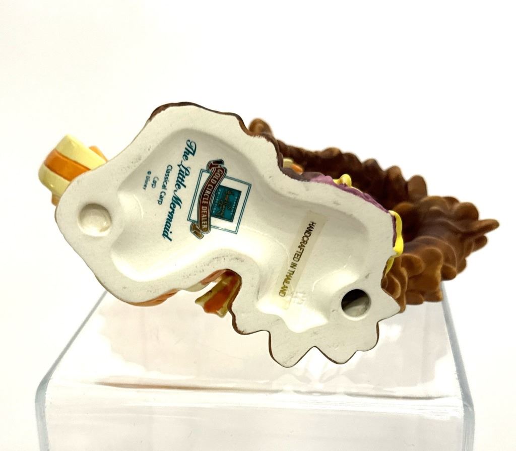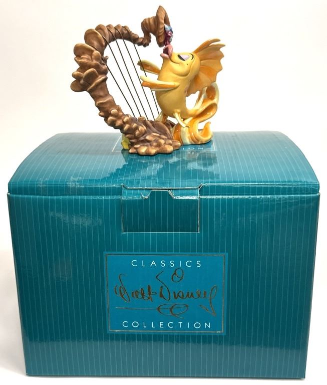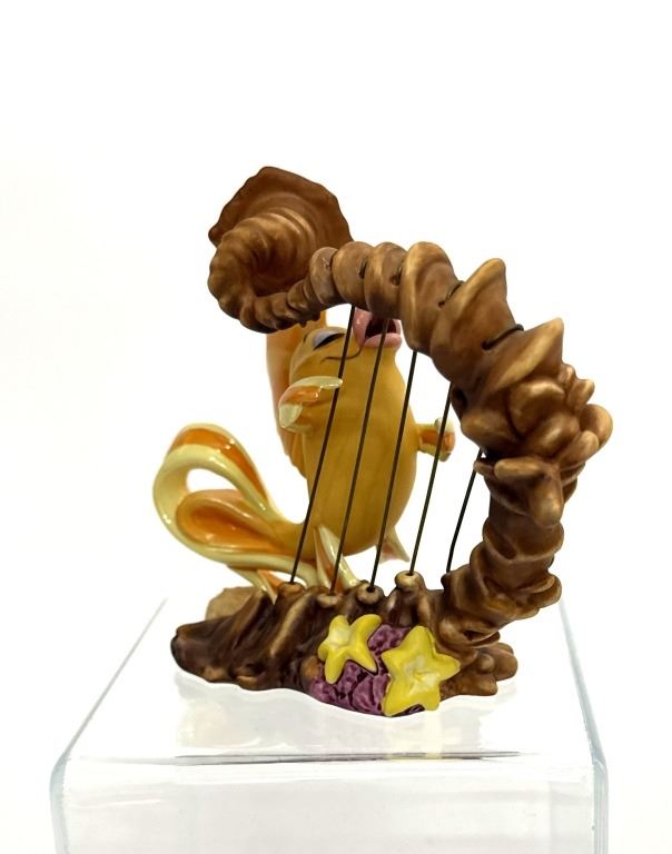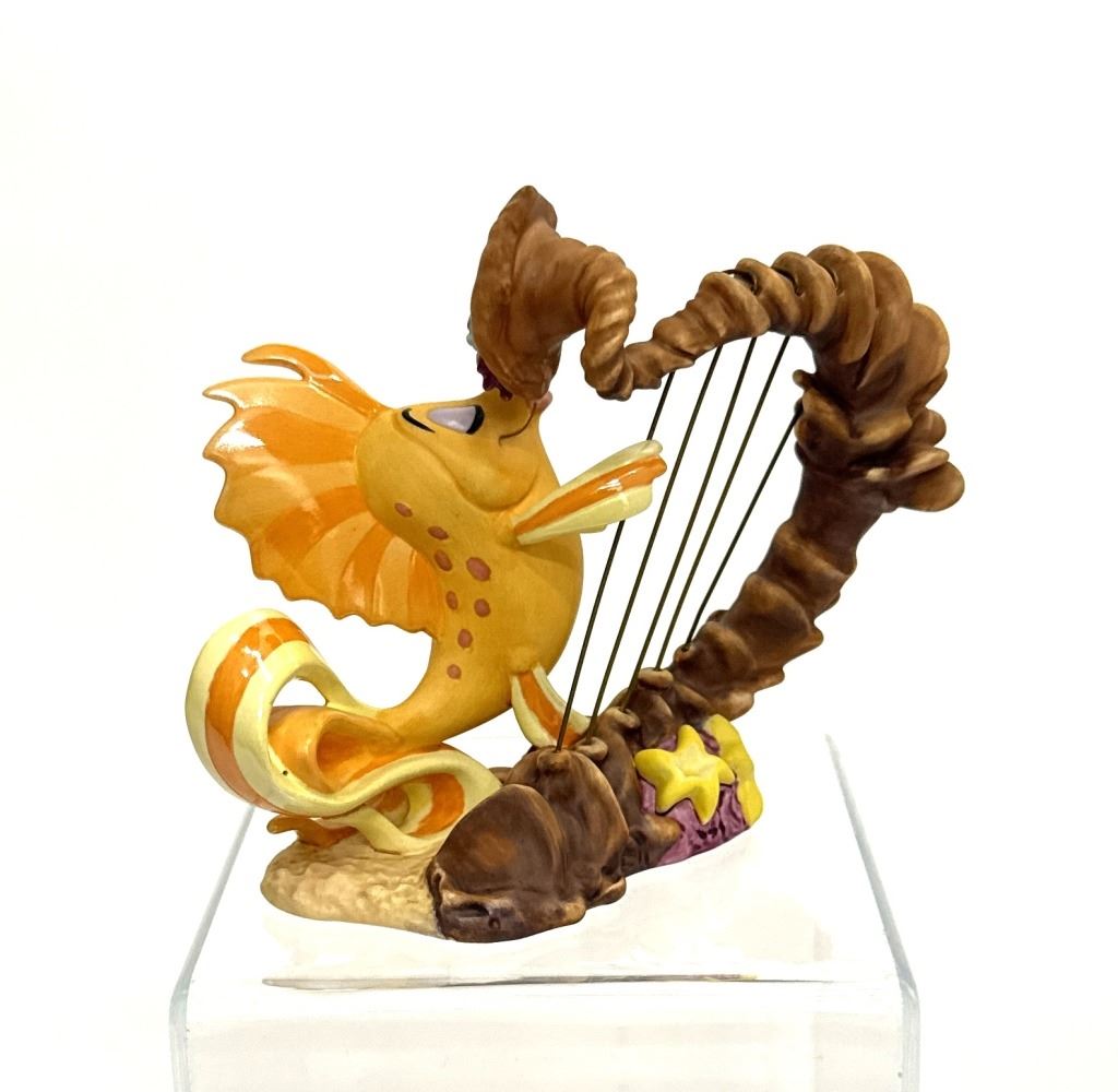 Item/Description: Walt Disney Classics Collection (WDCC) "Classical Carp" or "Carp with Harp" featuring a yellow and orange carp fish from the "Under the Sea" musical sequence in Disney's The Little Mermaid. Made of porcelain, the fins and tail are accented with an opalescent pain finish, and metal harp strings. The figurine was only produced in 1998 as a Gold Circle Dealer Exclusive edition. Includes original box and Certificate of Authenticity.