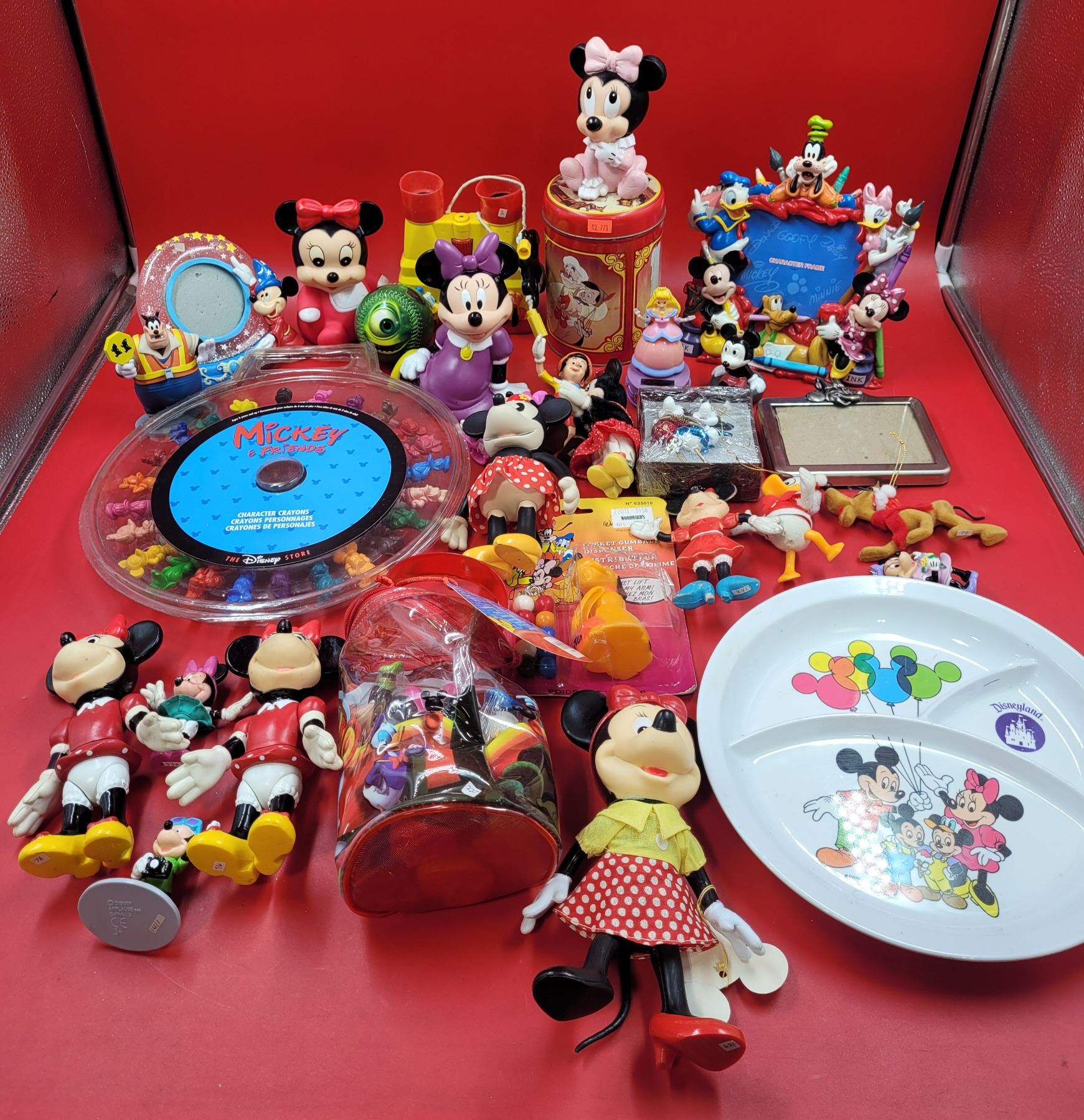 Disney Collectible Lot w/ Divided Plate, Character Crayons, Plastic Binoculars, & More