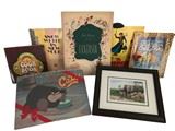 A Disney lover's collection featuring a 2012 Larry Datson framed artists's print of Disney's Animal Kingdom (10"x12"), 1940 Fantasia program, a Disney Cats 1985 calendar featuring all the cats from various films, Winnie The Pooh's Stories for Christmas book (1996), Snow White in New York softcover book from 1986, 1974 Disney on Parade program book, and a Disneyland Fun Food Cook Book from 1976.