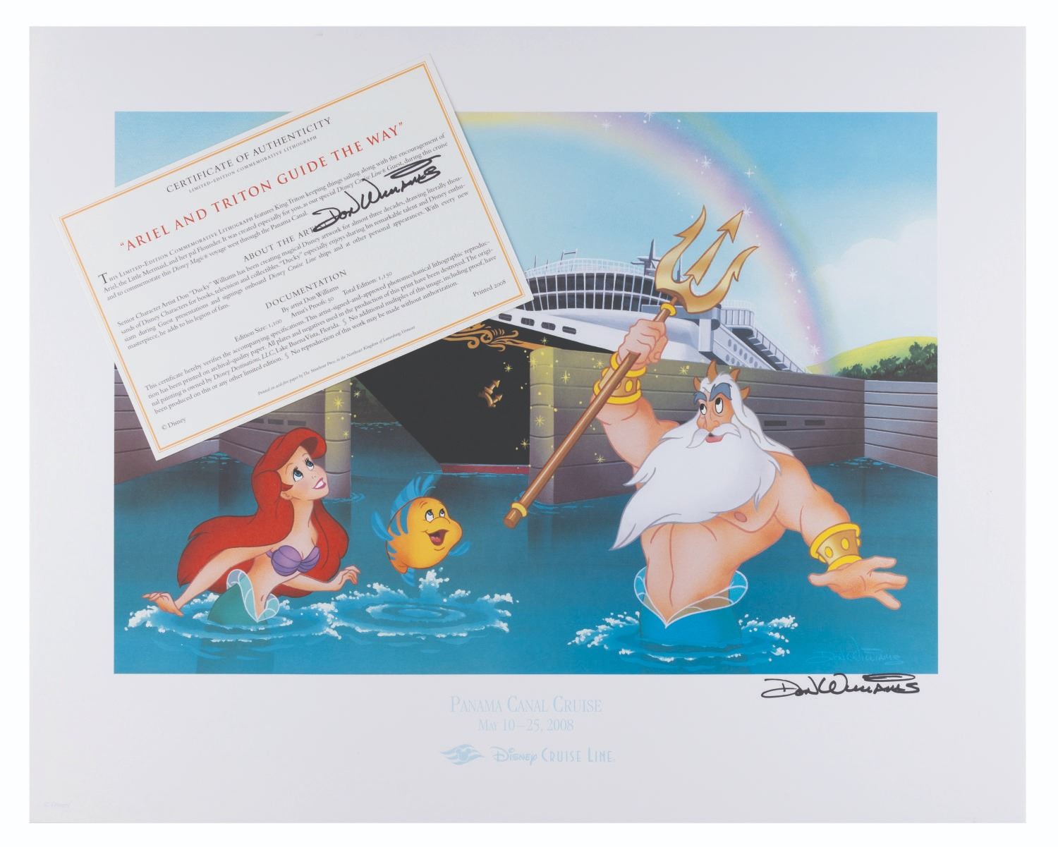 (Disney, 2008) A lithograph of Ariel, Flounder, with the Disney Magic Cruise Ship. Titled “Ariel and Triton Guide the Way,” the piece commemorates the Disney Magic’s voyage west through the Panama Canal. Released in a limited edition of 1,100 plus 50 Artist’s Proofs, this lithograph is signed by the artist Don Williams. With an image size of 11.25” x 16.25” on 16” x 20” paper, the art is in fine condition.