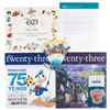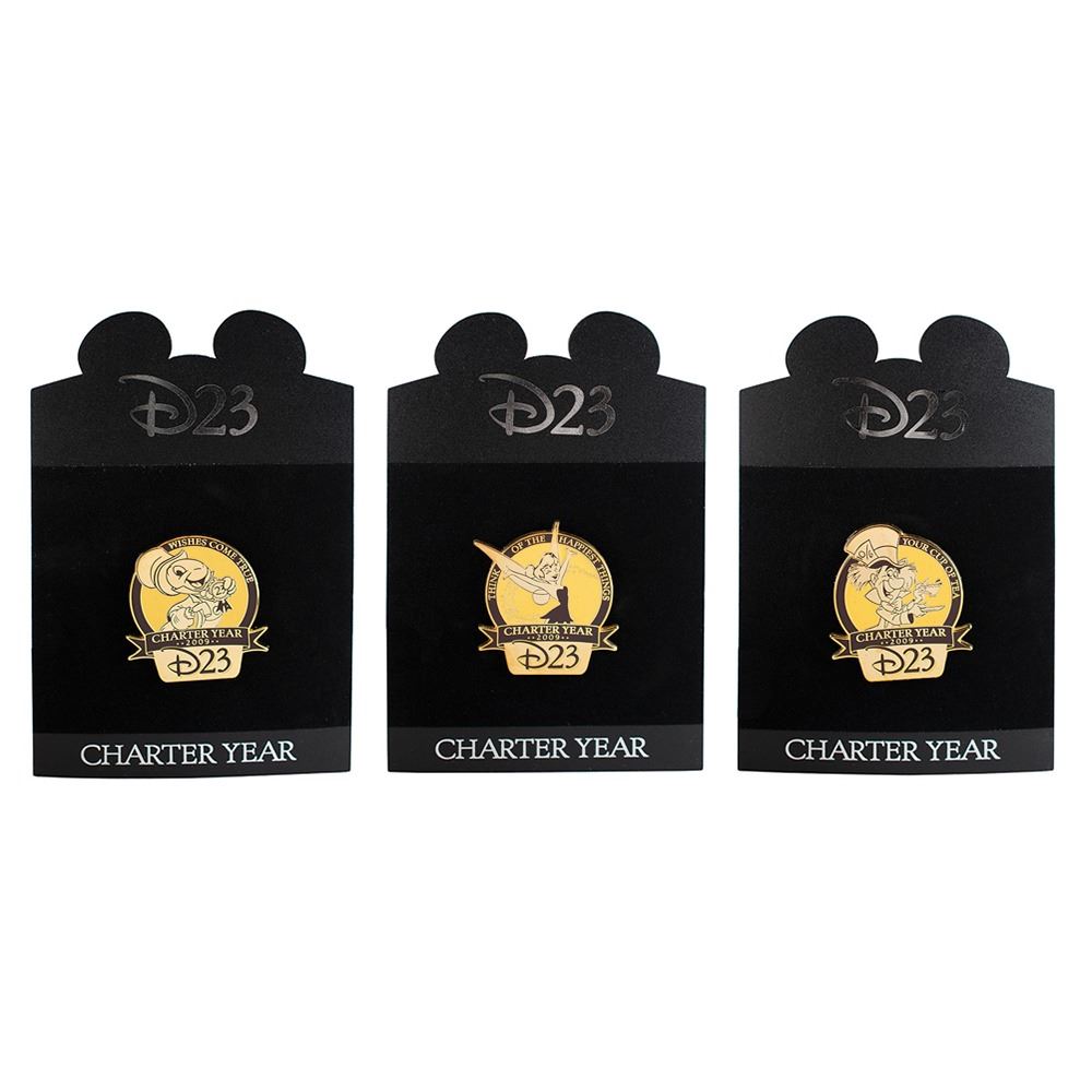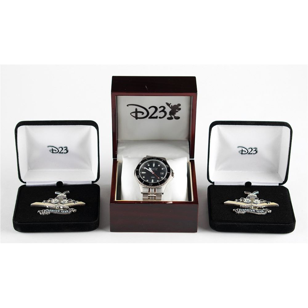 Group of items from D23: The Official Disney Fan Club, including: a D23 diver's-style wristwatch in its original box; two D23 "Charter Year" pins inspired by the 'Plane Crazy' cartoon, featuring rotating propellers, in their original cases; three D23 pins from 2009—featuring Tinker Bell, Jiminy Cricket, and the Mad Hatter—on their original "Charter Year" cardboard backers; a reproduction of the 1955 "Acres of Fun" Disneyland souvenir fan made exclusively for D23 members, in its original envelope; a membership certificate and letter with pre-printed signature of President and CEO Bob Iger; the Summer 2009 issue of Twenty-Three; and the Fall 2009 issue of Twenty-Three, with D23 member exclusive embroidered "Disneyland '59" patch. In overall fine to very fine condition.